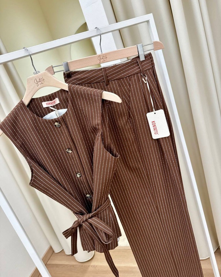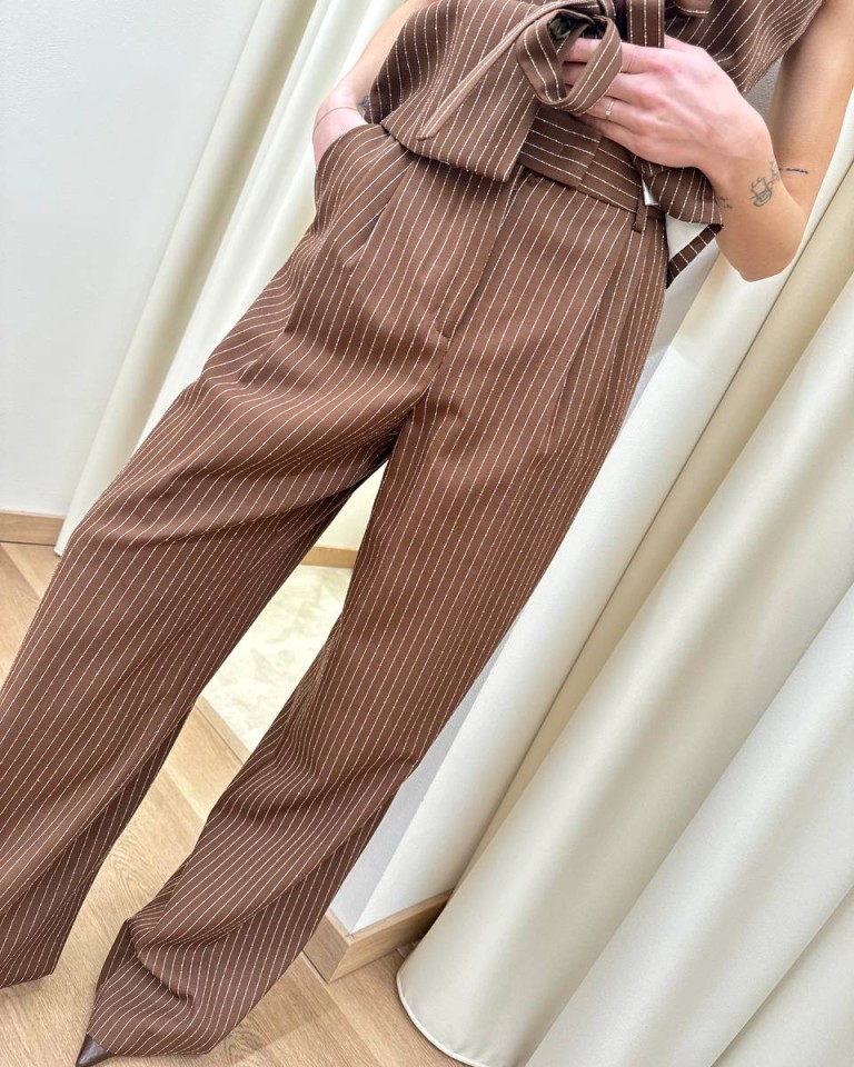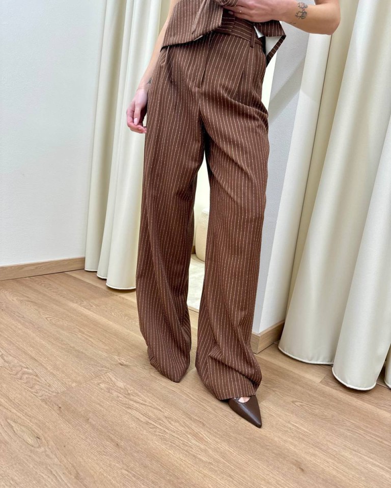 Pantalone color tabacco gessato bianco, modello a gamba dritta, vita alta con doppia pinces davanti e cinturino con passanti, tasche laterali e una tasca a filetto dietro. Chiusura con zip e gancio interno davanti. Vestibilità regolare.