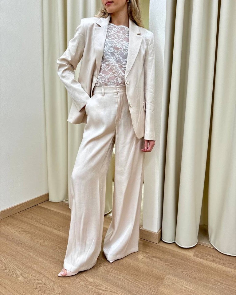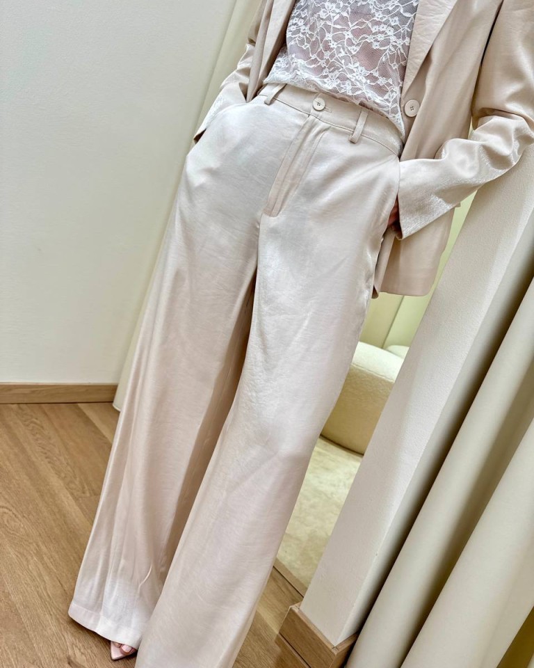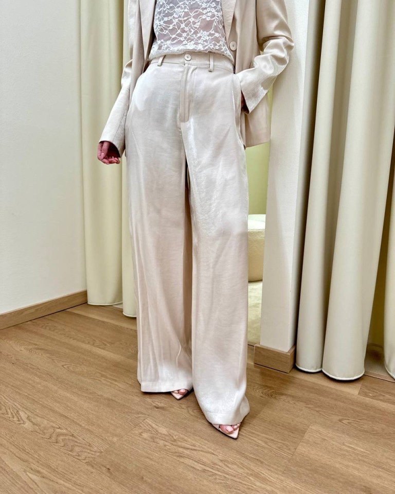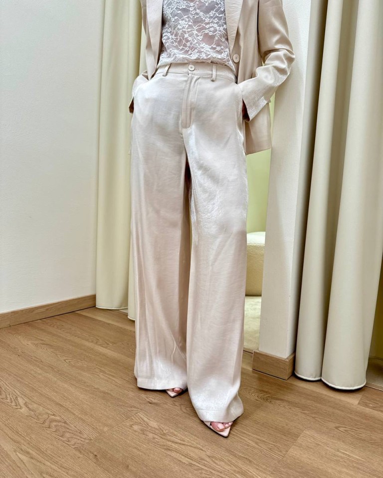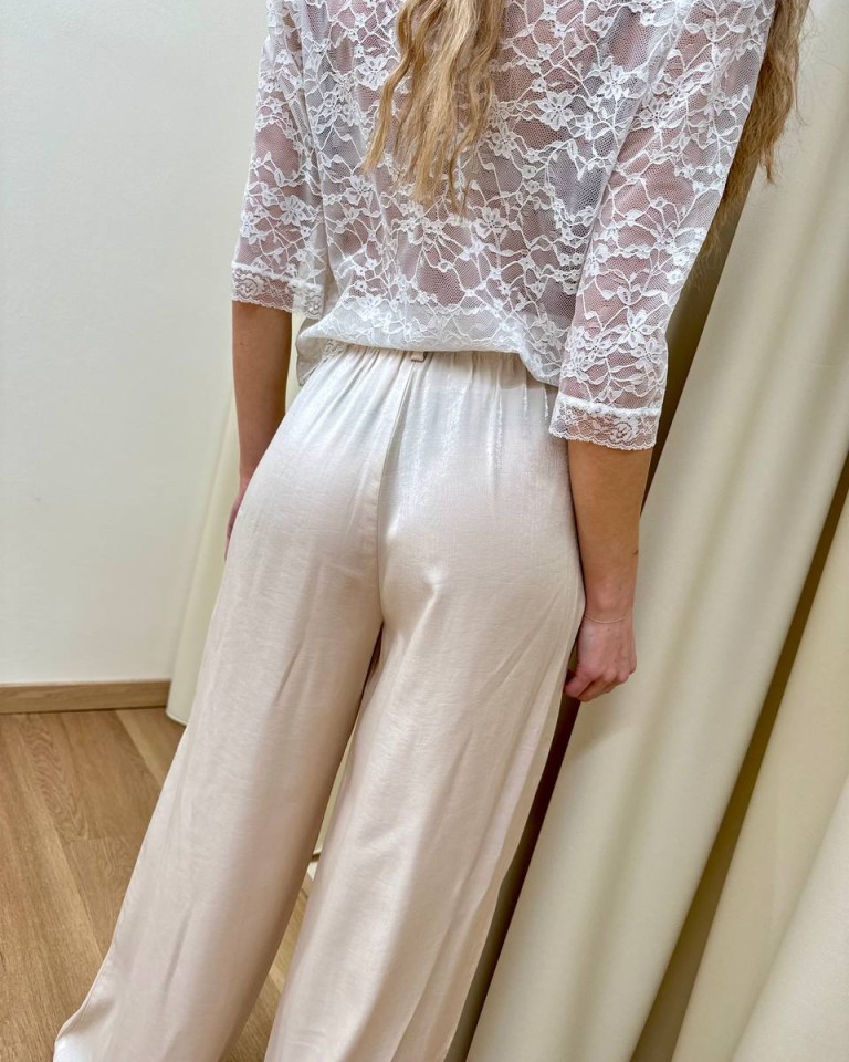 Pantalone in tessuto semilucido color avorio, modello fluido a palazzo, vita alta con passanti ed elastico sul dietri, tasche laterali e chiusura davanti con zip e bottone. Vestibilità regolare.