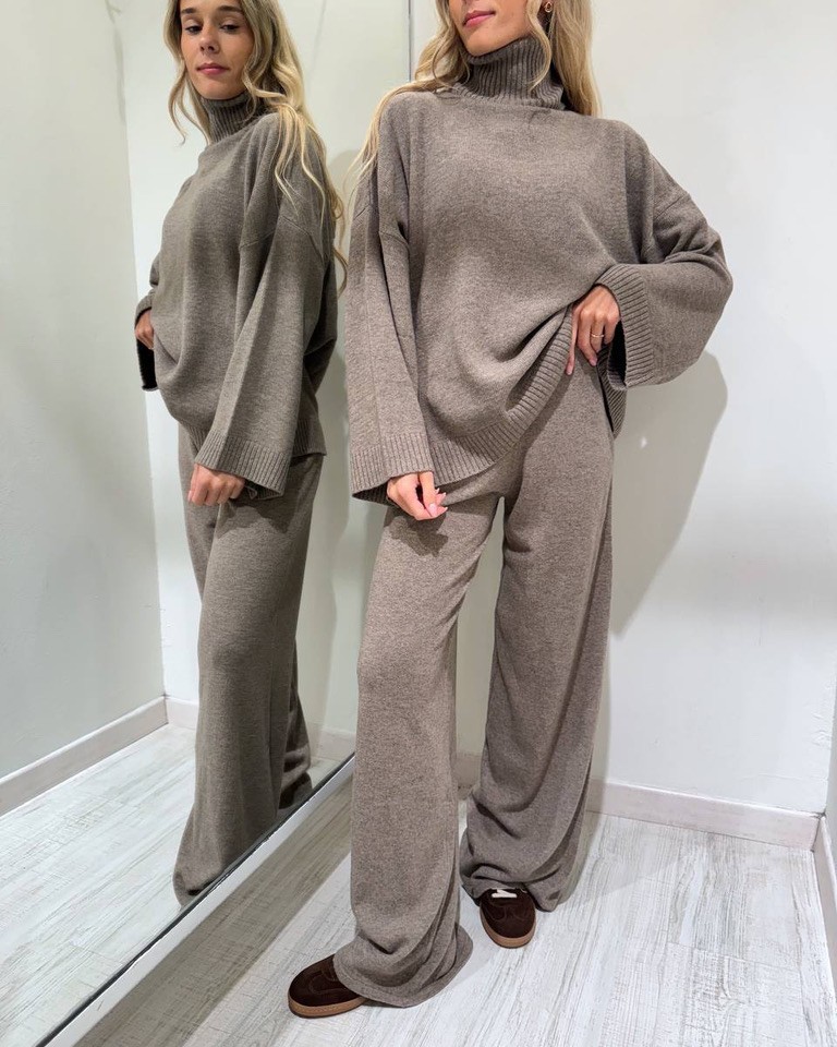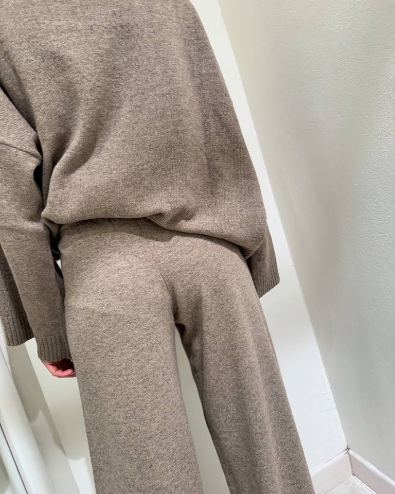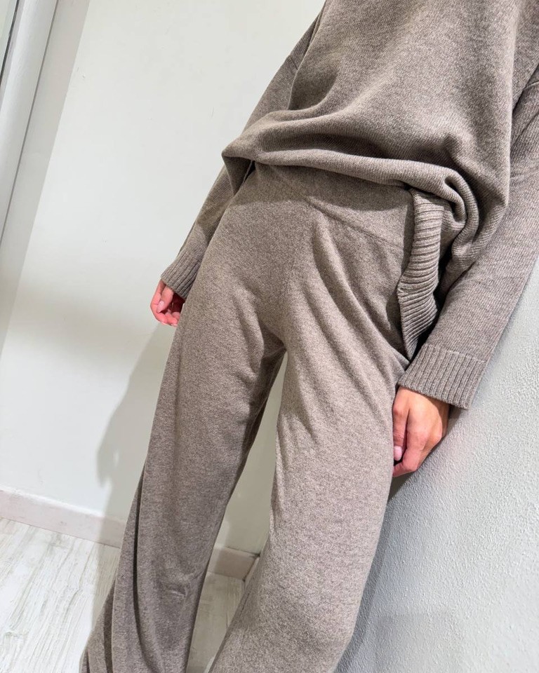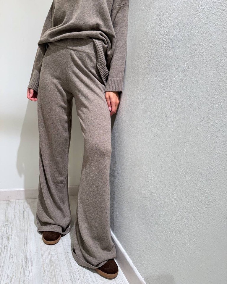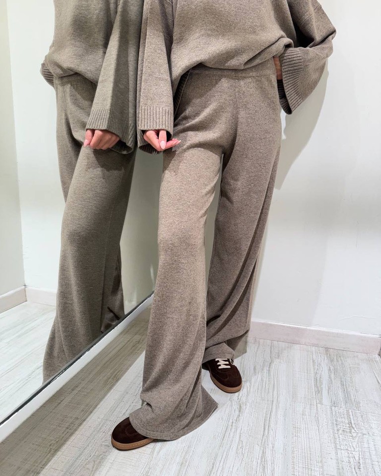 Pantalone in maglia color tortora in viscosa, lana e cachemire, modello dritto e morbido e vita alta con fascia elastica. Vestibilità regolare.