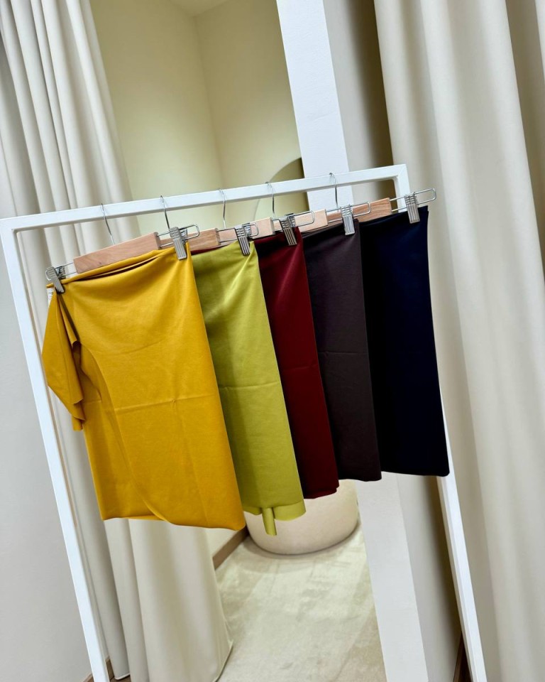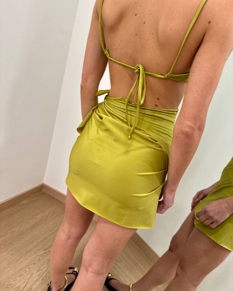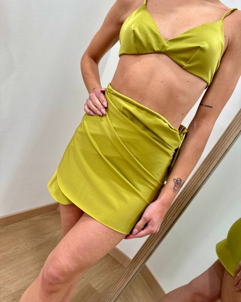 Pareo Annette in lycra lucida color verde olio, modello corto modulabile grazie all’annodatura in vita. Vestibilità regolare.