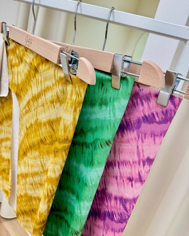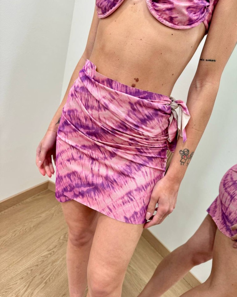 Pareo Annette in lycra fantasia tie dye rosa con lurex, modello corto modulabile grazie all’annodatura in vita. Vestibilità regolare.
