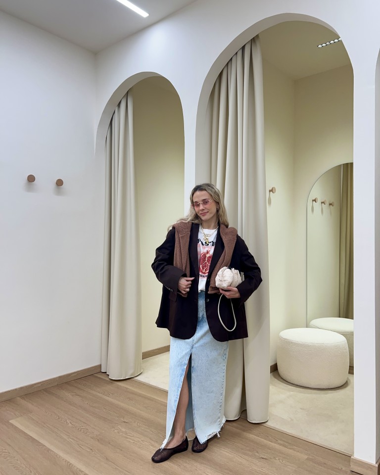 Un mix equilibrato tra casual e raffinato. La t-shirt bianca con stampa vivace e la gonna lunga in denim chiaro con spacco creano una base semplice, mentre il blazer moro oversize aggiunge struttura. Il maglione sulle spalle scalda l’insieme e gli accessori, come occhiali rosati e clutch morbida, danno un tocco chic senza appesantire. È perfetto per un aperitivo in spiaggia, grazie alla sua leggerezza ma con un tocco curato.