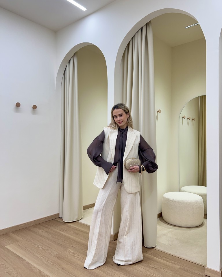 Un completo chiaro gessato con gilet e pantaloni ampi, abbinato a una blusa morbida e trasparente color moro con fiocco al collo. Il look è completato da una clutch dorata, che aggiunge luce ed eleganza.