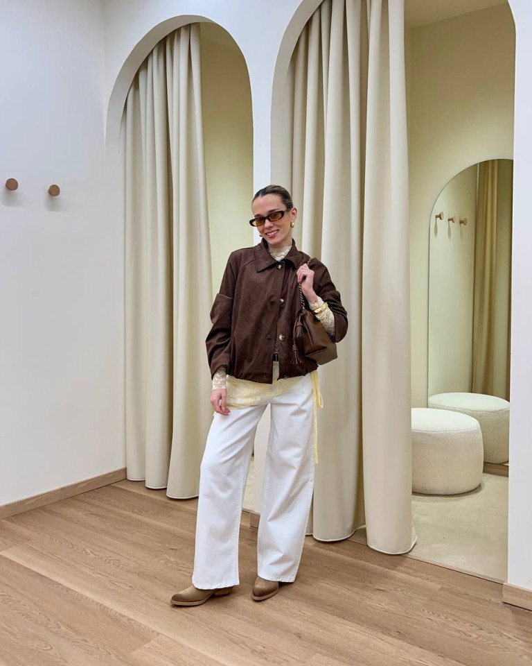 Outfit elegante ma rilassato, giocato su toni caldi e neutri. Un jeans bianco ampio, dal taglio pulito, abbinato ad una maglia leggera in pizzo gialla pastello con dettagli delicati che aggiungono femminilità . Sopra, un bomber corto marrone scamosciato dona struttura e un tocco più deciso al look. Gli accessori sono ben coordinati: un foulard in pizzo abbinato alla maglia annodato in vita, borsa a spalla marrone, stivaletti nella stessa tonalità e occhiali da sole per un accento contemporaneo. Il risultato è un insieme sofisticato ma facile da indossare, perfetto per il giorno.