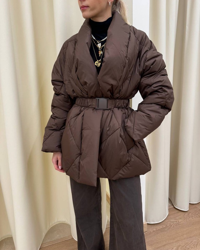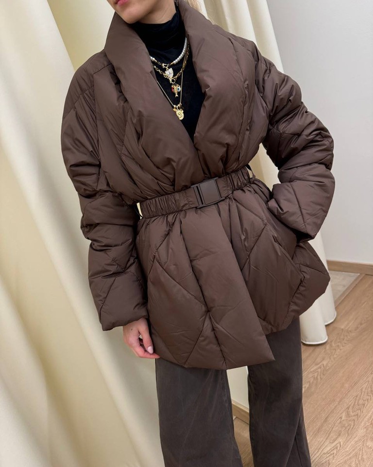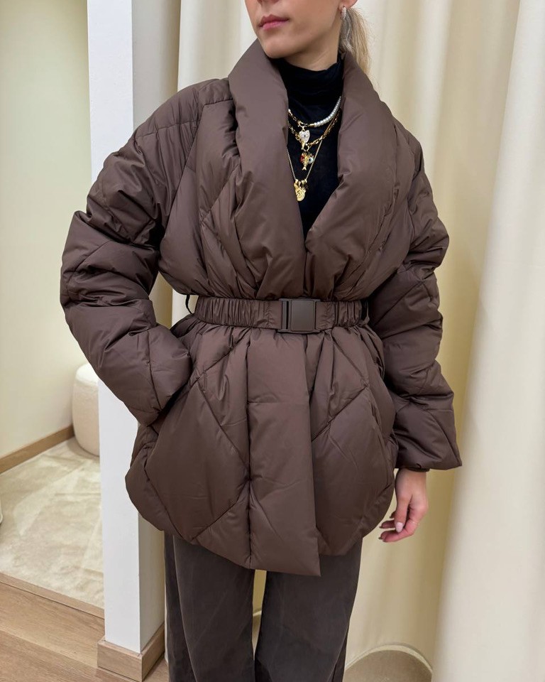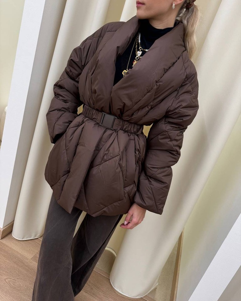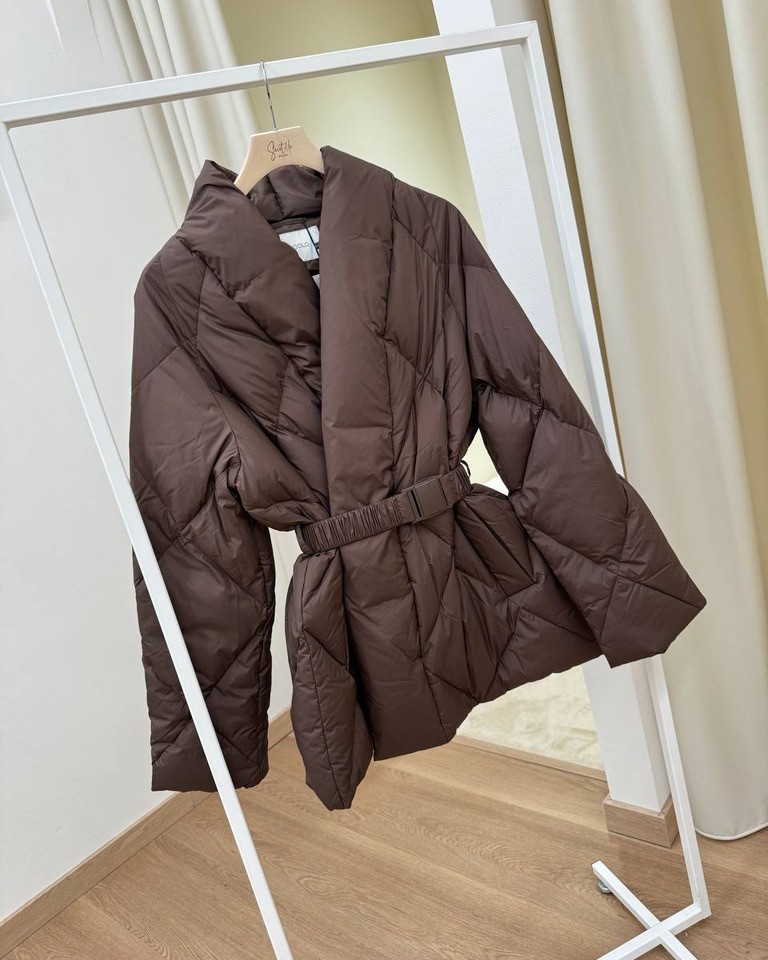 Piumino imbottito in vera puma d’oca color moro, modello trapuntato maniche lunghe con elastico interno su polsi, collo e chiusura frontale con cintura in tono elastica ad incastro. Vestibilità regolare.