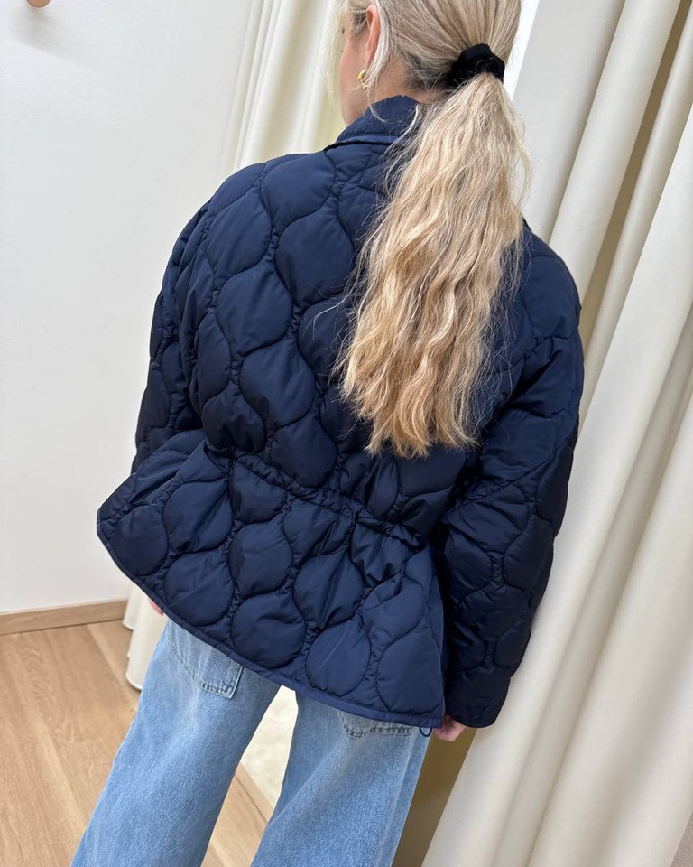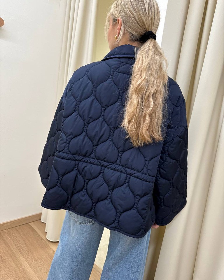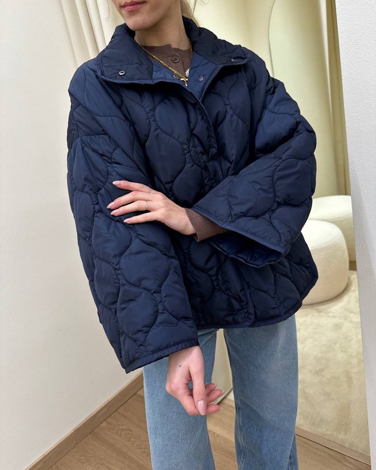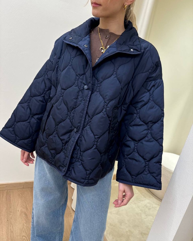 Piumino blu trapuntato, modello over a scatoletta, collo alto, giro sceso e maniche lunghe ampie, tasche davanti e spacchetti laterali con bottone. Coulisse interna regolabile in vita. Chiusura davanti con bottoni automatici. Vestibilità ampia.