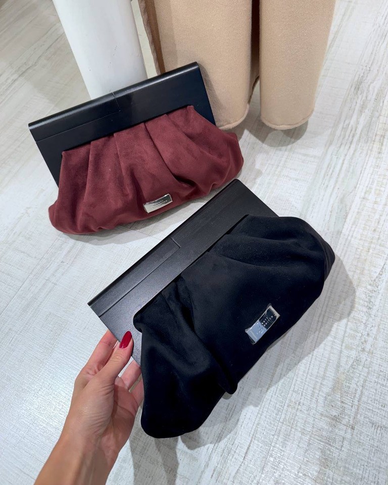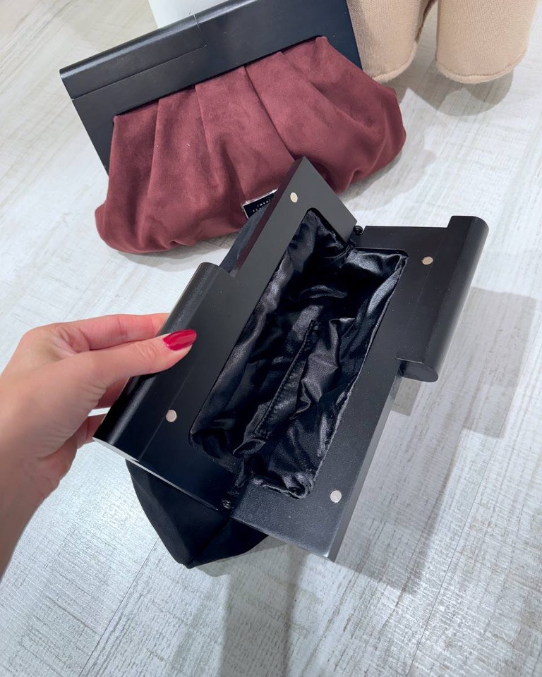 Pochette Alamak nera in velluto, modello pasticcino con manico ad incastro in legno nero. Targhetta con logo frontale.