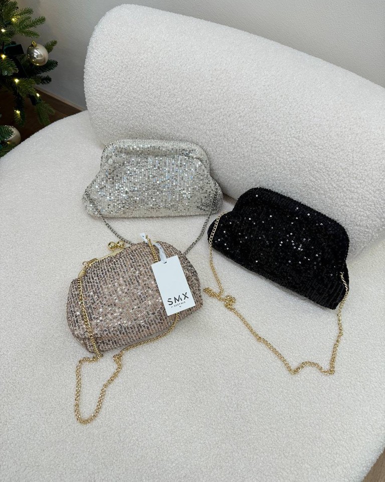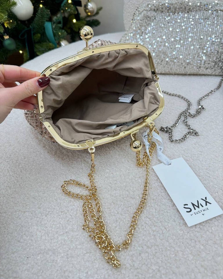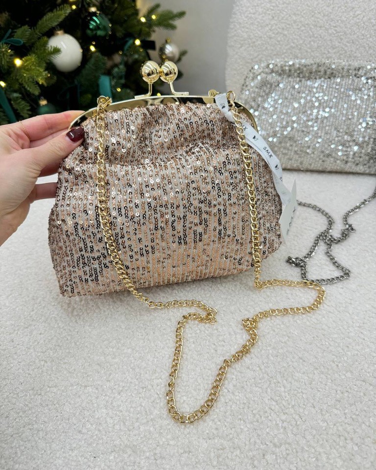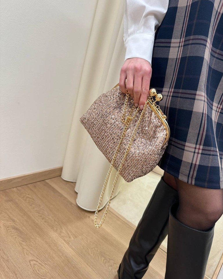 Pochette morbida in paillettes champagne, chiusura clic clac in metallo dorato, tracolla a catenella rimovibile.