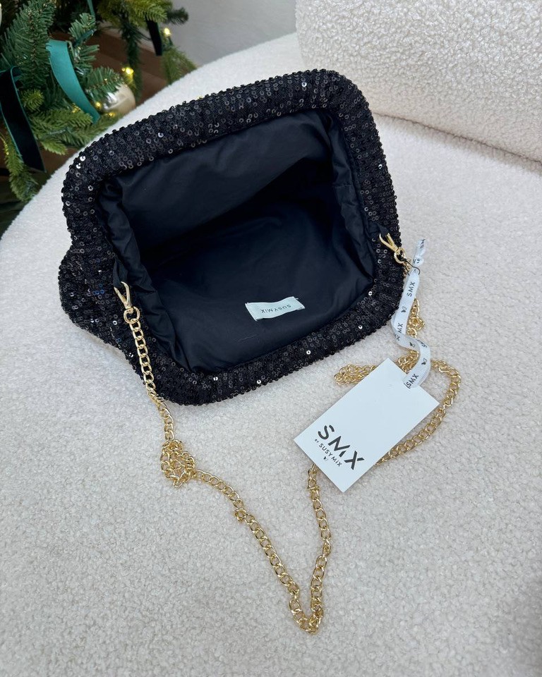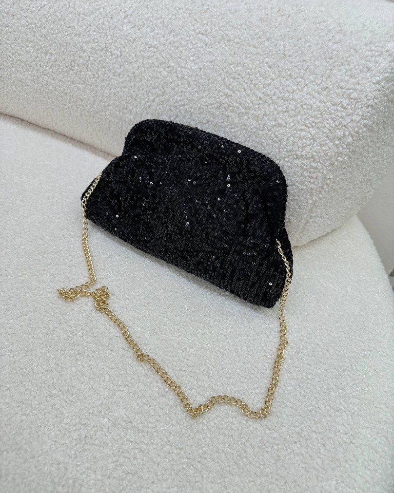 Pochette morbida in paillette nere, chiusura rigida a molla interna, tracolla rimovibile.