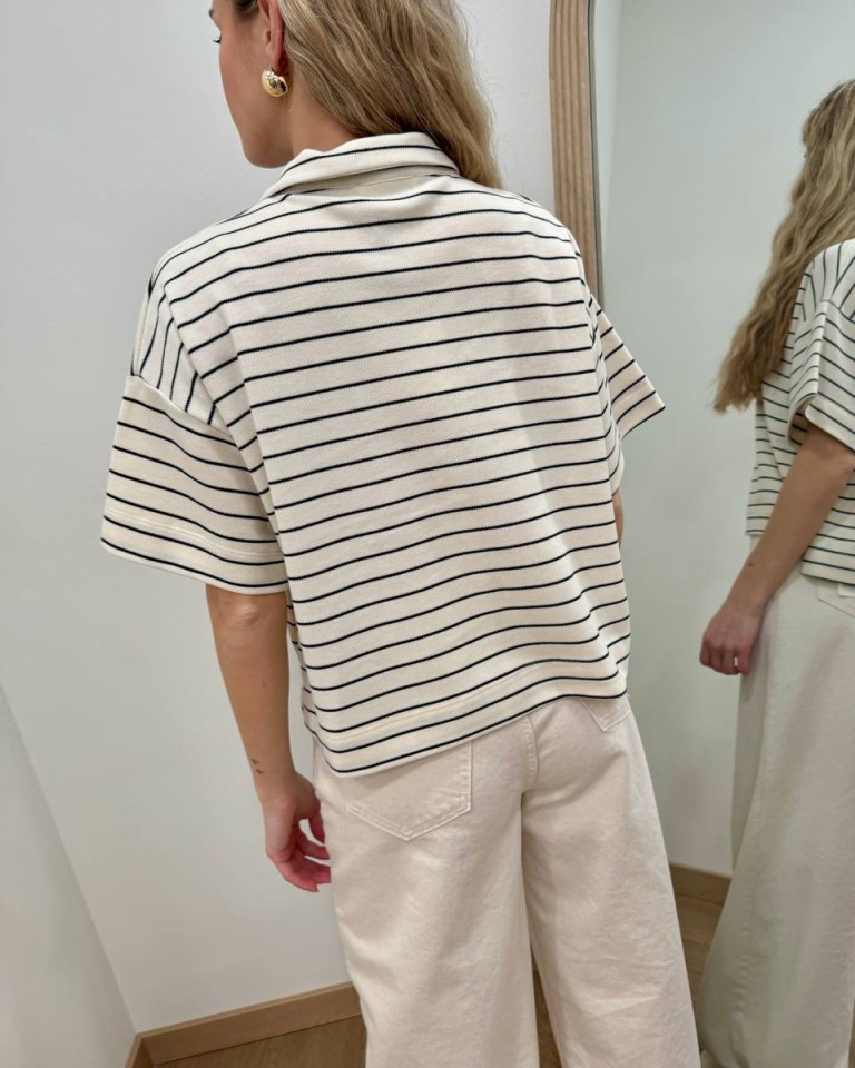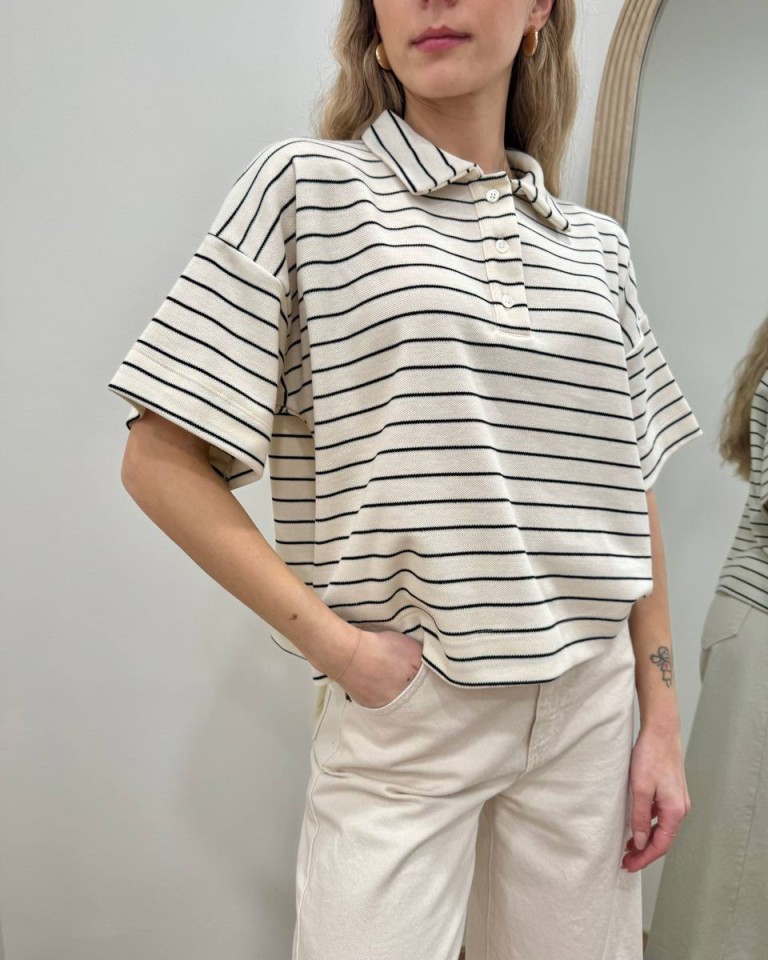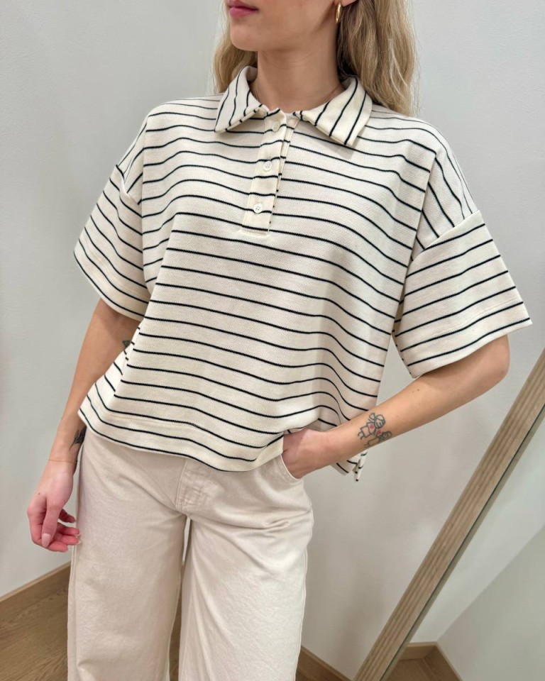 Polo a righe panna e nero, modello corto a scatoletta, manica corta con giro sceso, colletto classico con tre bottoni in tono. Vestibilità ampia.