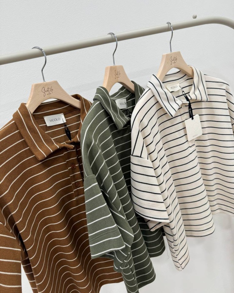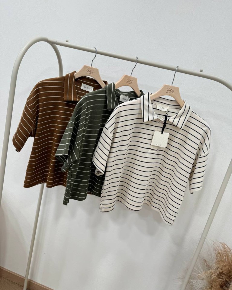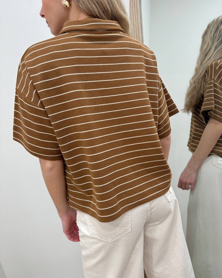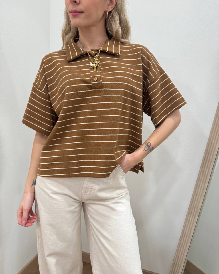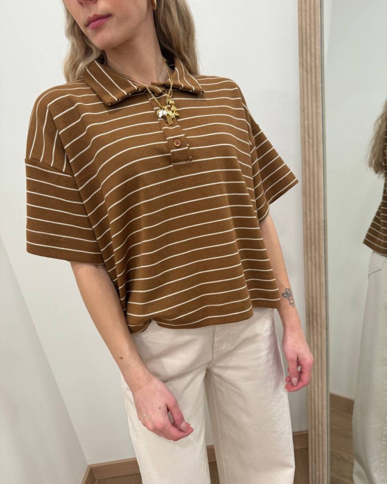 Polo a righe tabacco e panna, modello corto a scatoletta, manica corta con giro sceso, colletto classico con tre bottoni in tono. Vestibilità ampia.