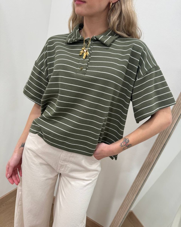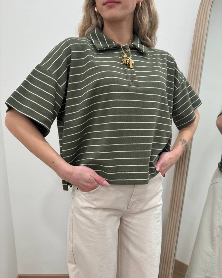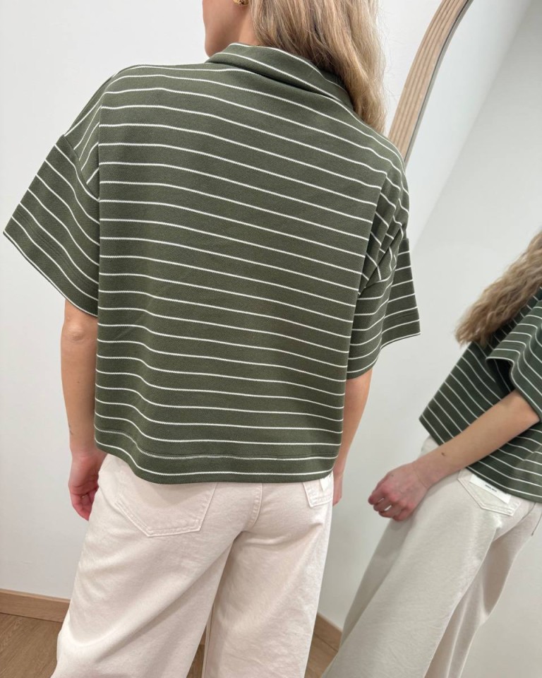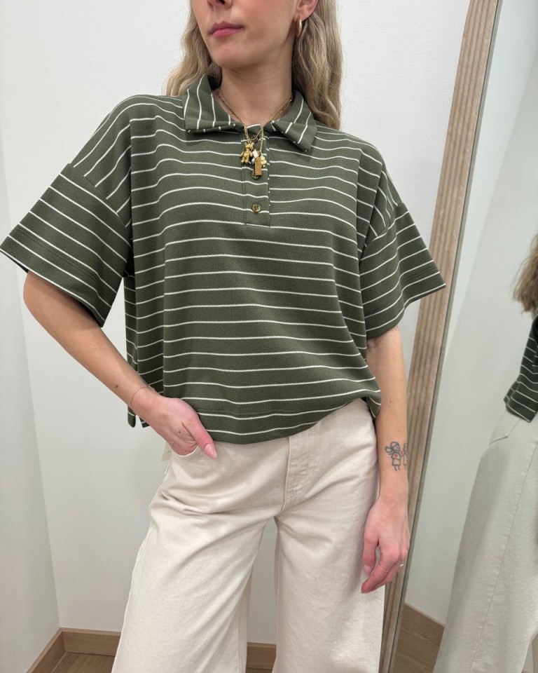 Polo a righe verde militare e panna, modello corto a scatoletta, manica corta con giro sceso, colletto classico con tre bottoni in tono. Vestibilità ampia.