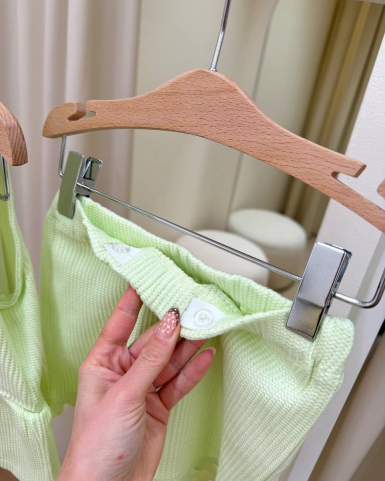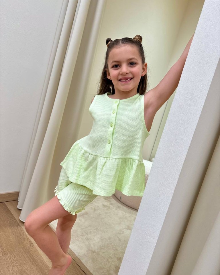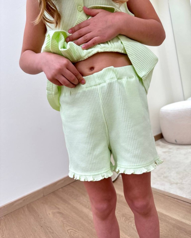 Shorts in spugna a nido d’ape color lime, modello a vita alta regolabile con elastico interno e rouches sull’orlo. Vestibilità regolare.