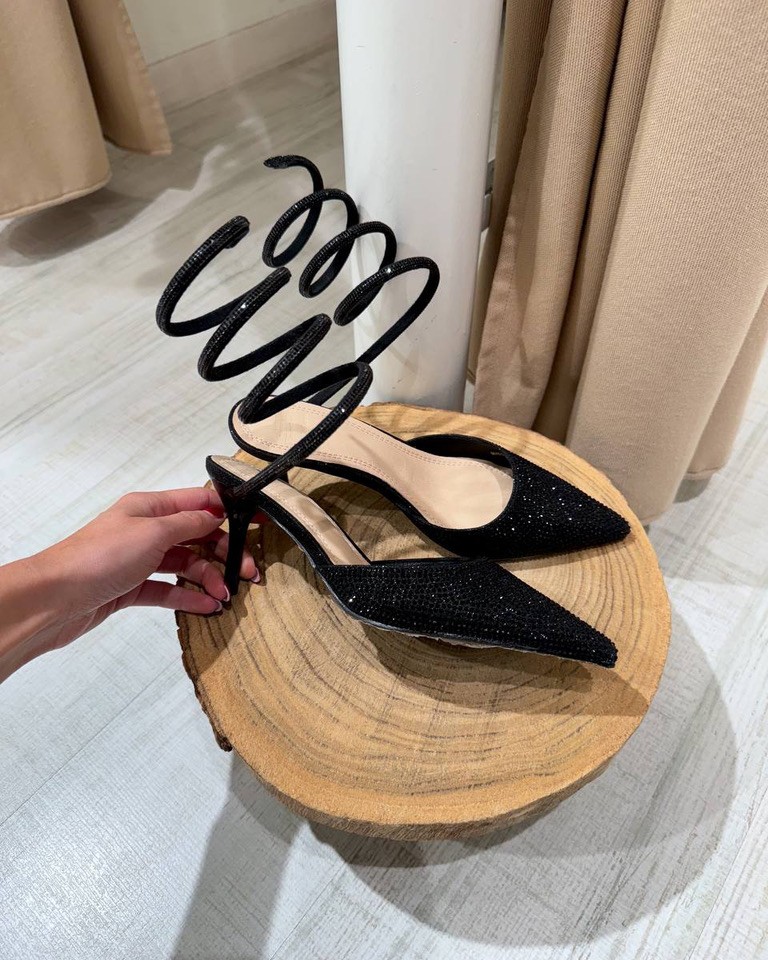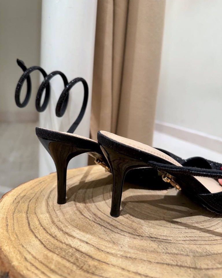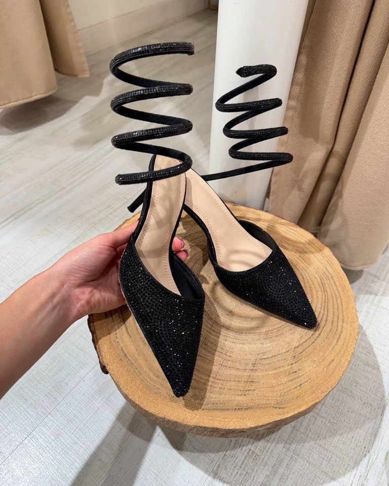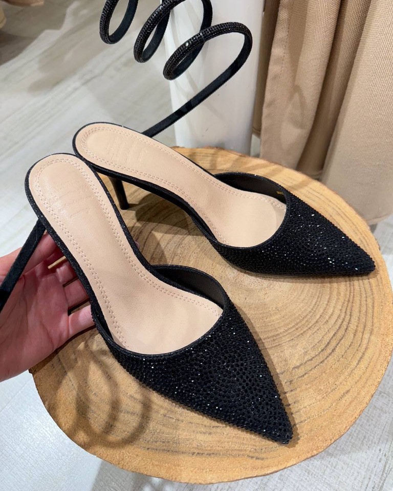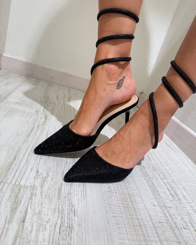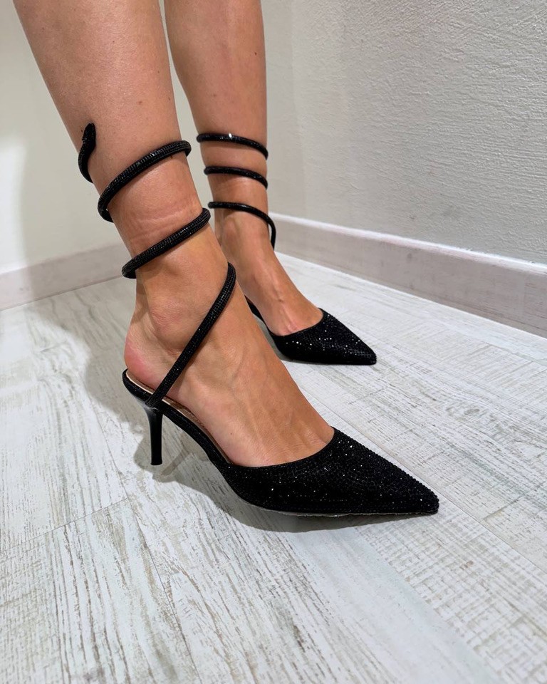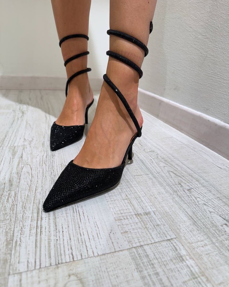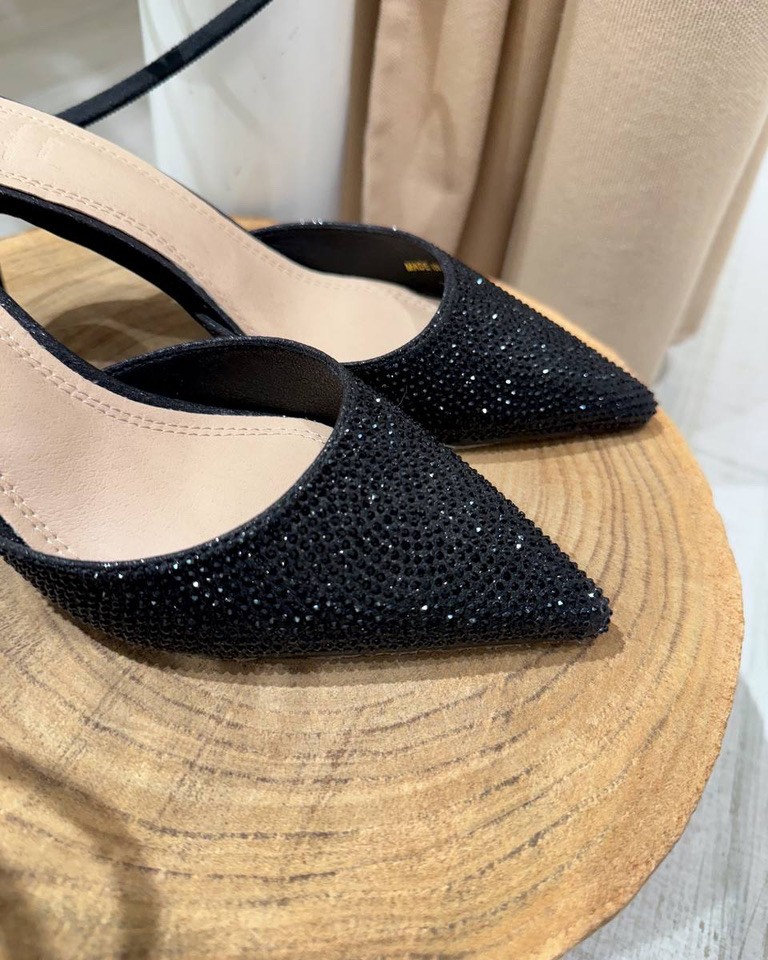 Slingback nera ricoperta da strass in tono, modello con punta allungata, e laccio rigido da mettere intorno alla caviglia. Tacco sottile di circa 7 cm. Calzata regolare.