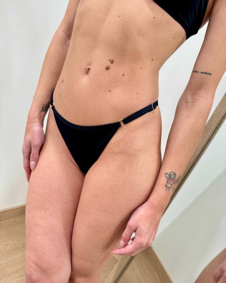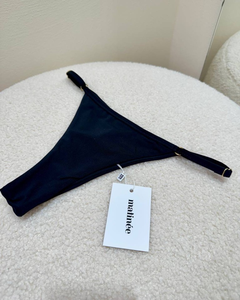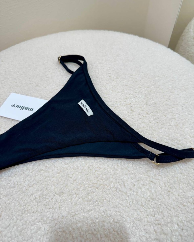 Slip bikini Marina nero tinta unita, modello sgambato con laterali regolabili. Vestibilità regolare, se si oscilla tra due taglie consigliamo la taglia sopra.