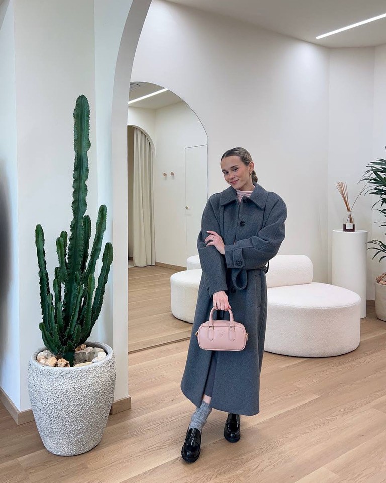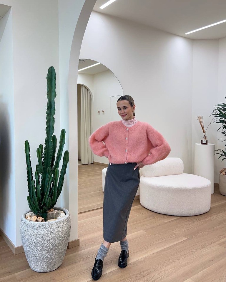 Un’eleganza delicata che gioca con colori e texture. Il cardigan rosa cipria, con bottoni gioiello, soffice e luminoso, è abbinato a una gonna midi grigia dalla linea pulita e femminile. I mocassini neri e le calze in lana completano il look con un tocco retrò rivisitato in chiave moderna. Completano il look un cappotto lungo grigio e una mini bag sui toni del rosa che riprende i colori sotto al capospalla.