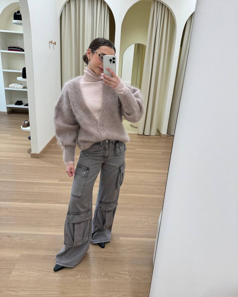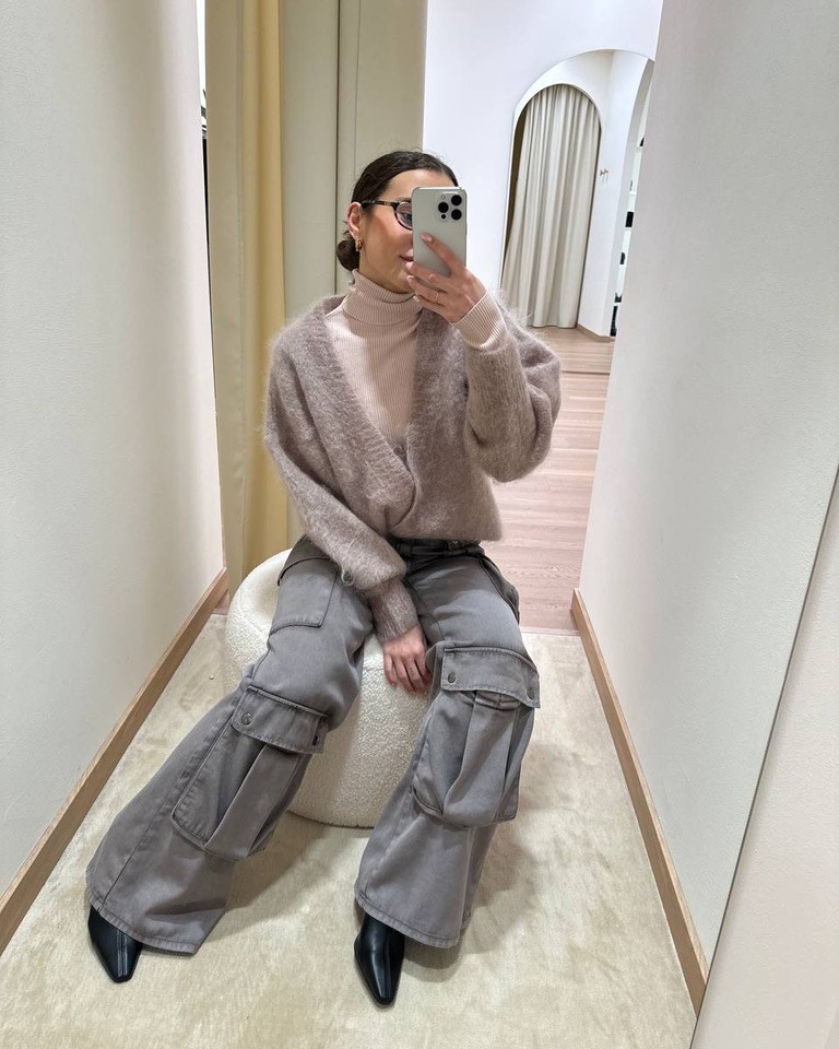 Un look dai toni neutri che unisce morbidezza e carattere. Il cardigan soffice color cipria, indossato sopra un dolcevita coordinato, crea un effetto avvolgente e raffinato. I pantaloni cargo grigio caldo, dal taglio ampio e contemporaneo, aggiungono un’anima utility e moderna. Un outfit versatile, ideale per chi ama uno stile casual curato e attuale.