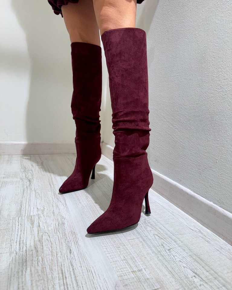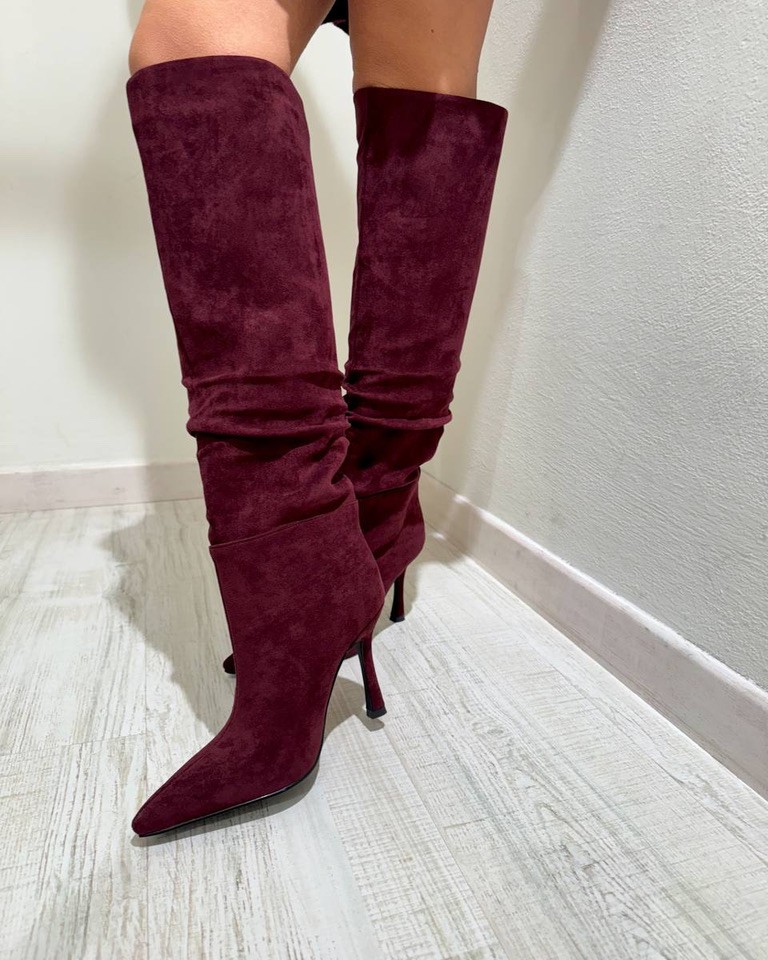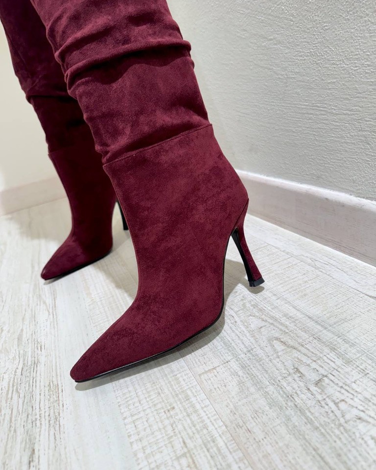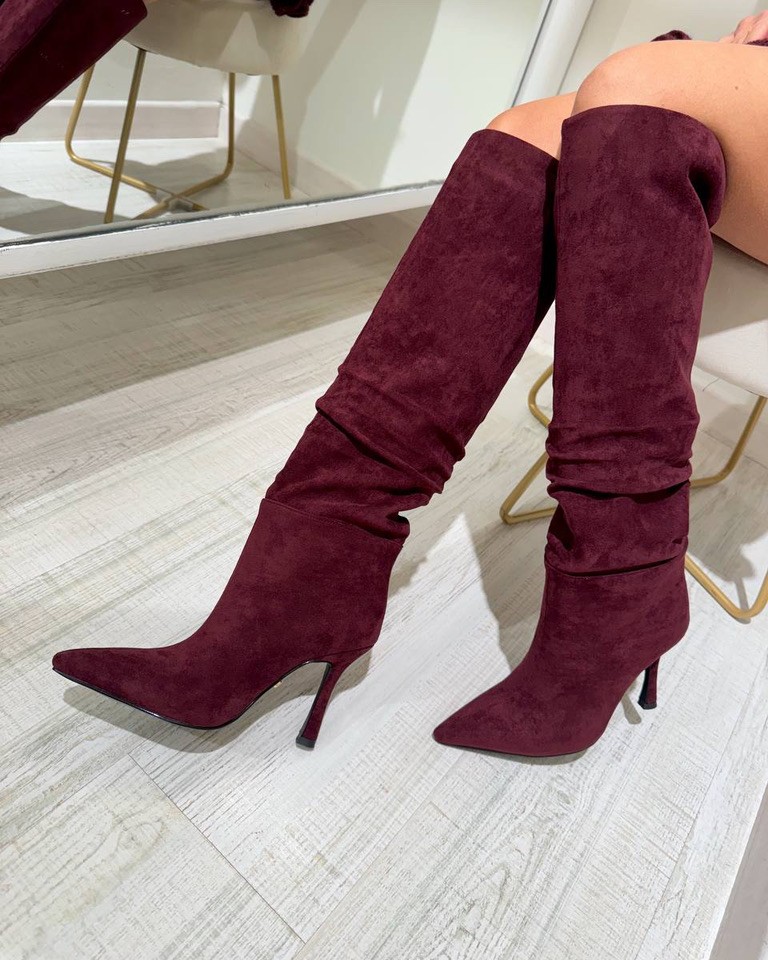 Stivale in velluto color prugna, modello alto con gambale effetto arricciato, punta allungata e tacco sottile di circa 10 cm. Calzata regolare.