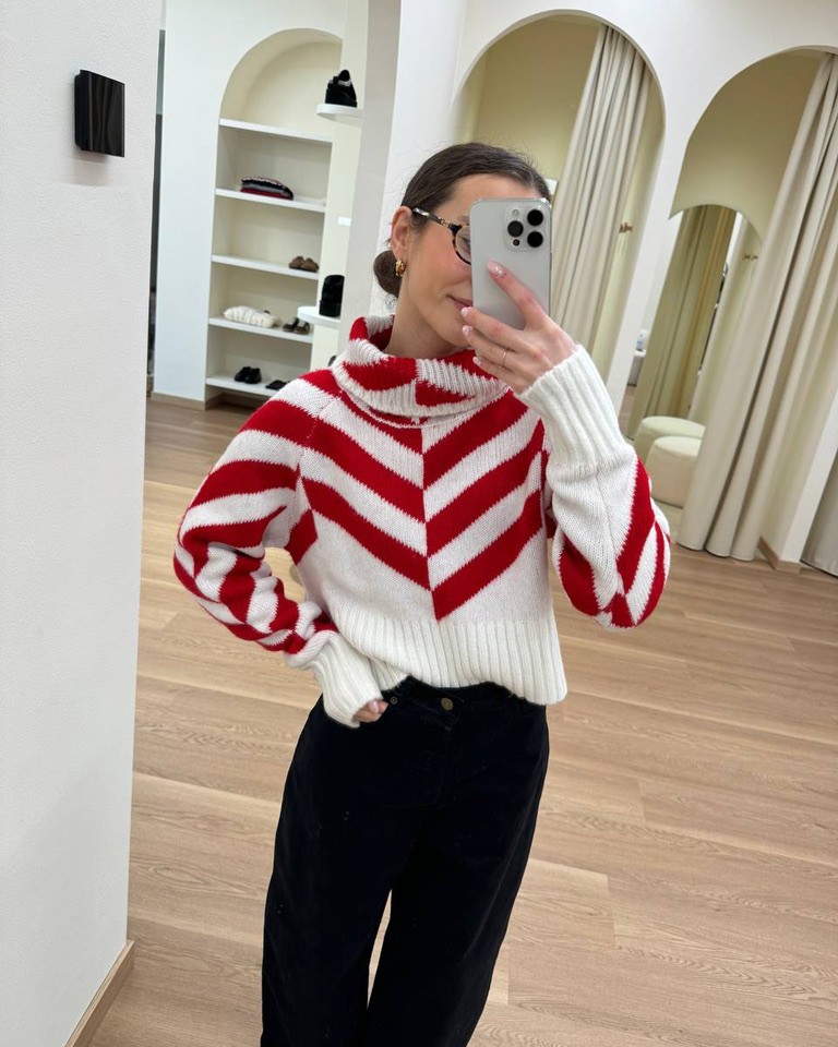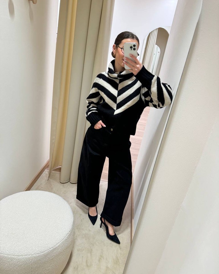 Un look moderno e raffinato che gioca con contrasti decisi. Il maglione a collo alto a righe bianche e nere o nella variante rossa dona un tocco grafico e contemporaneo, perfetto per chi ama uno stile audace ma elegante. I jeans neri a palloncino valorizzano la silhouette con un fit morbido e trendy, aggiungendo personalità all’outfit. Completano il look le décolleté nere, che regalano un’eleganza senza tempo, ideale per passare dal giorno alla sera con classe e comfort.