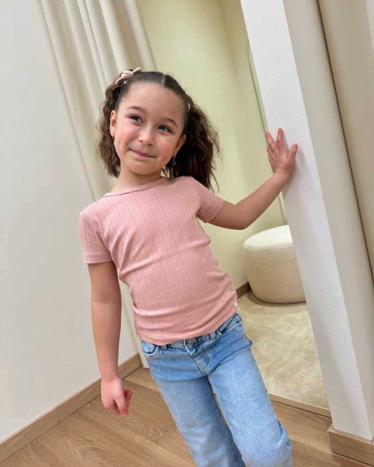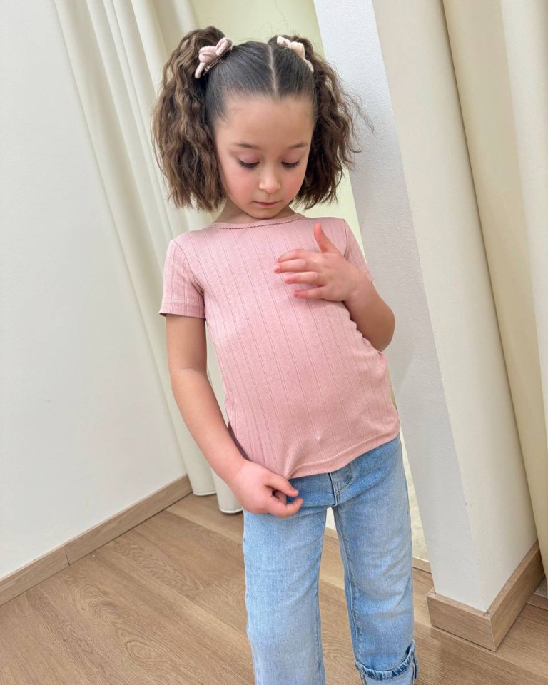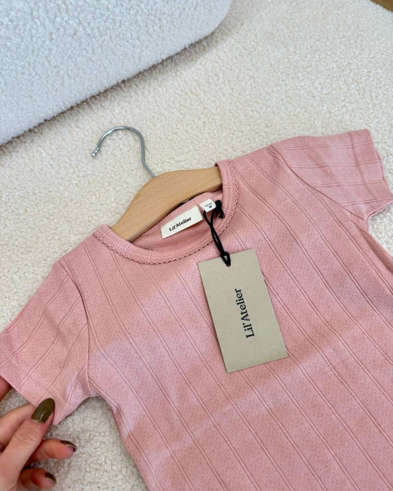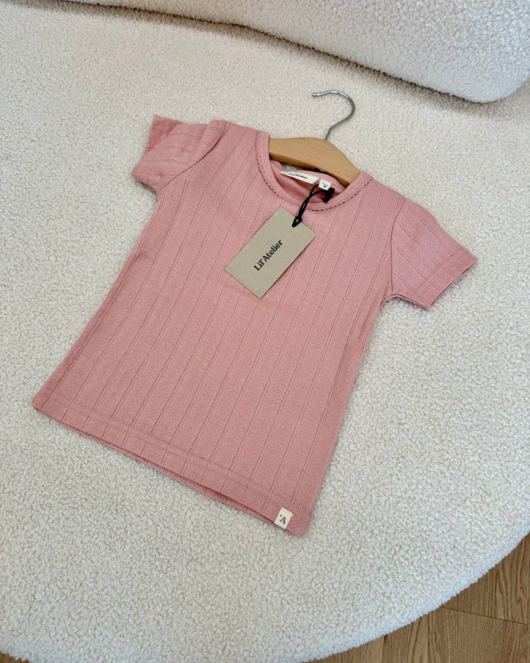 T-shirt in maglia a coste larghe color rosa antico, modello a maniche corte, dritto, girocollo con bordino ricamato. Vestibilità regolare.