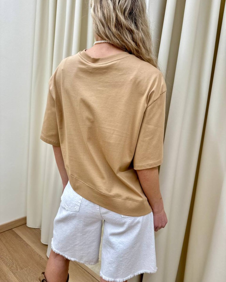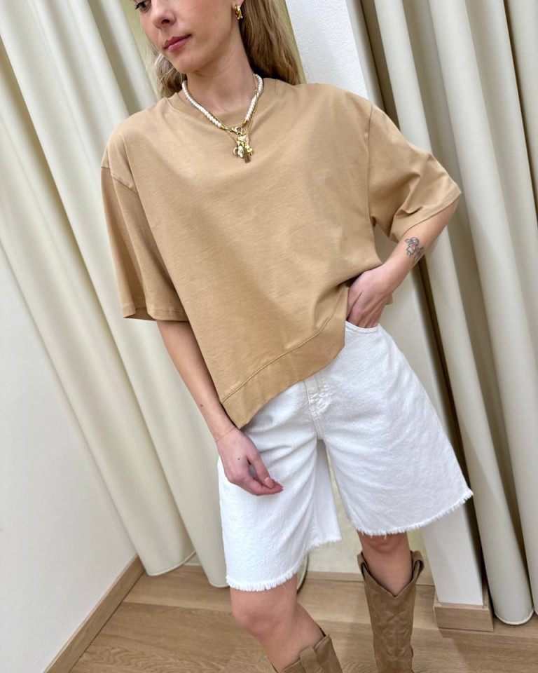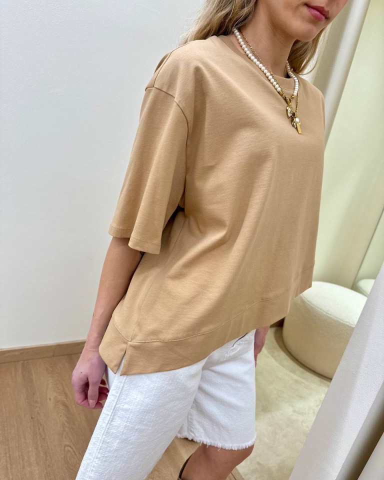 T-shirt cammello, modello over, corto, girocollo con orlo asimmetrico e spacchetti laterali, maniche corte e giro sceso. Vestibilità ampia.