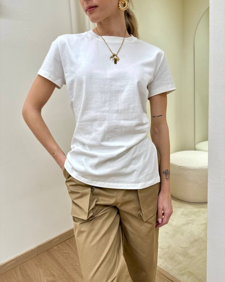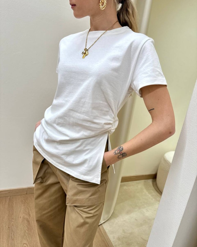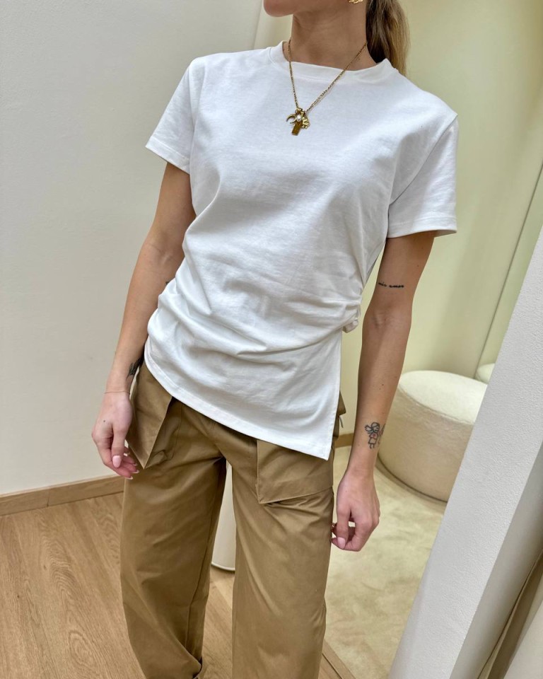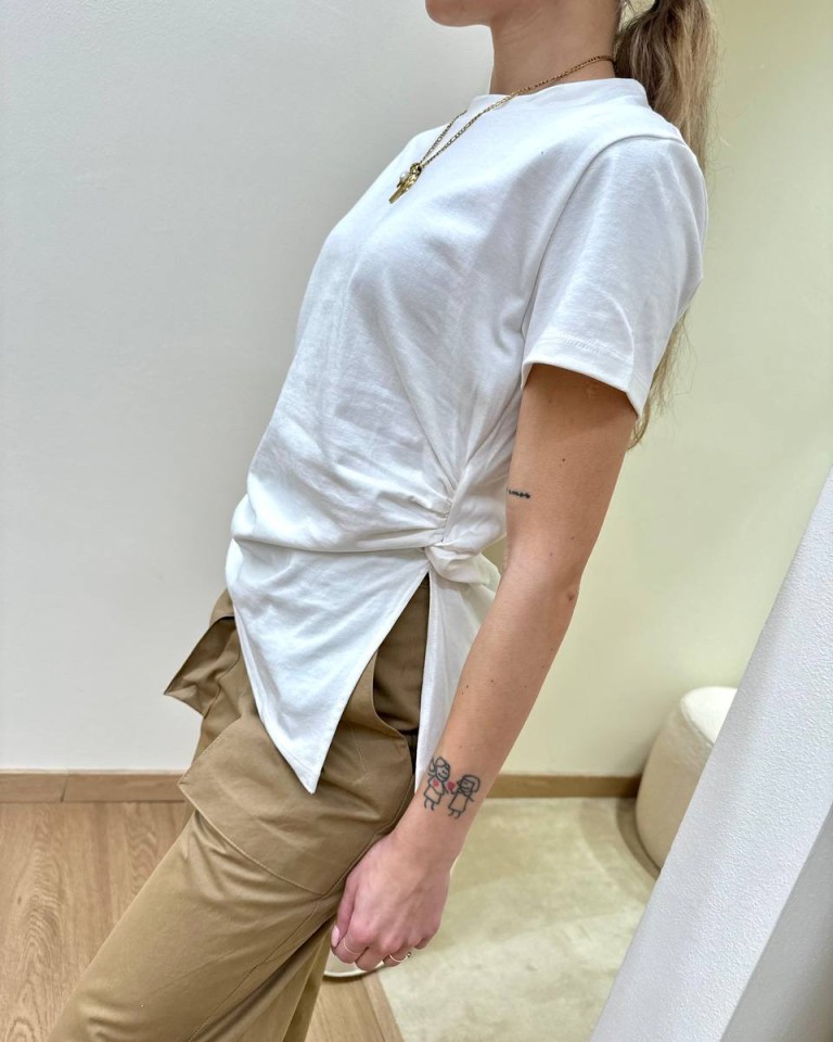 T-shirt in maglia bianca, modello avvitato girocollo, manica corta con arricciatura e spacco sul fianco. Vestibilità regolare.