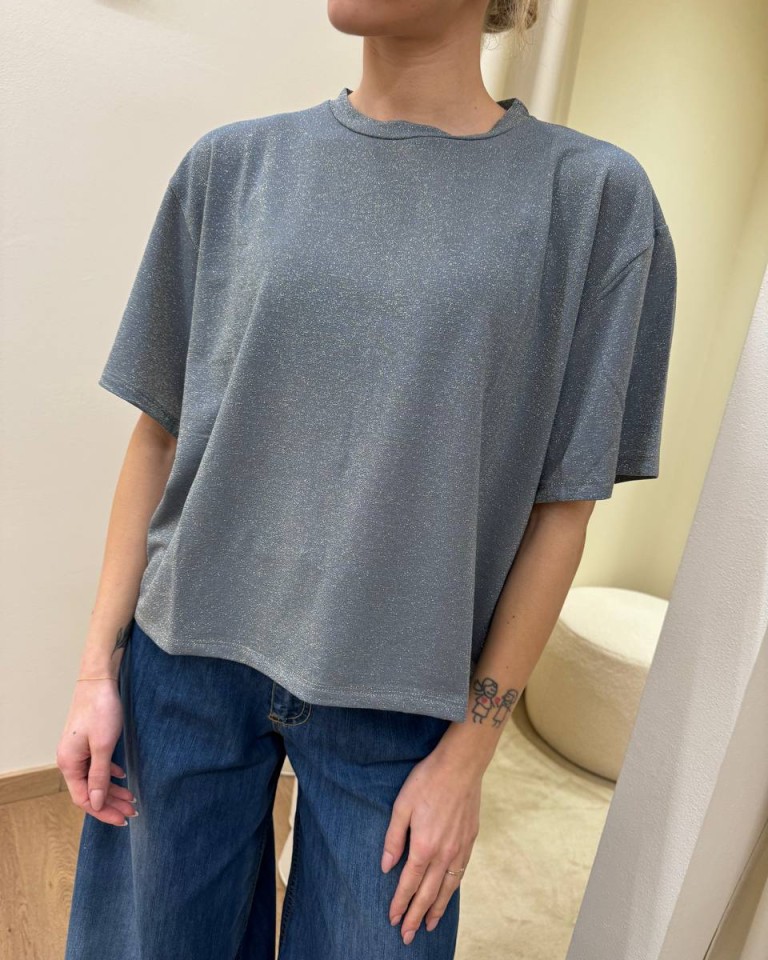 T-shirt in maglia color denim con lurex oro, modello classico, girocollo, mezza manica. Vestibilità ampia.