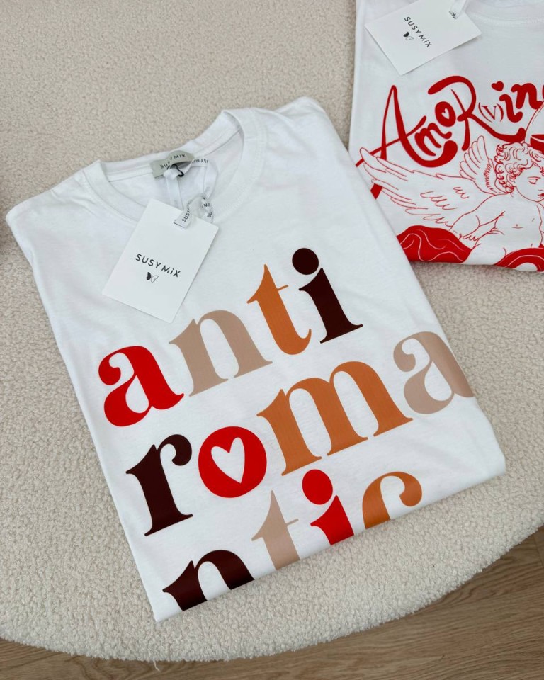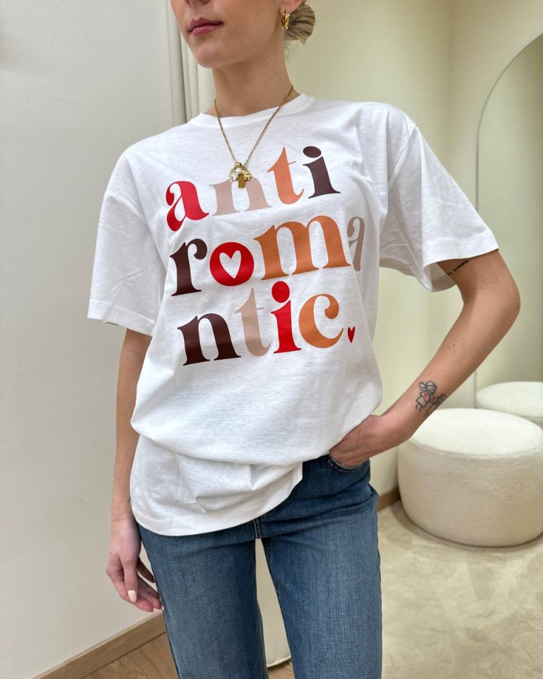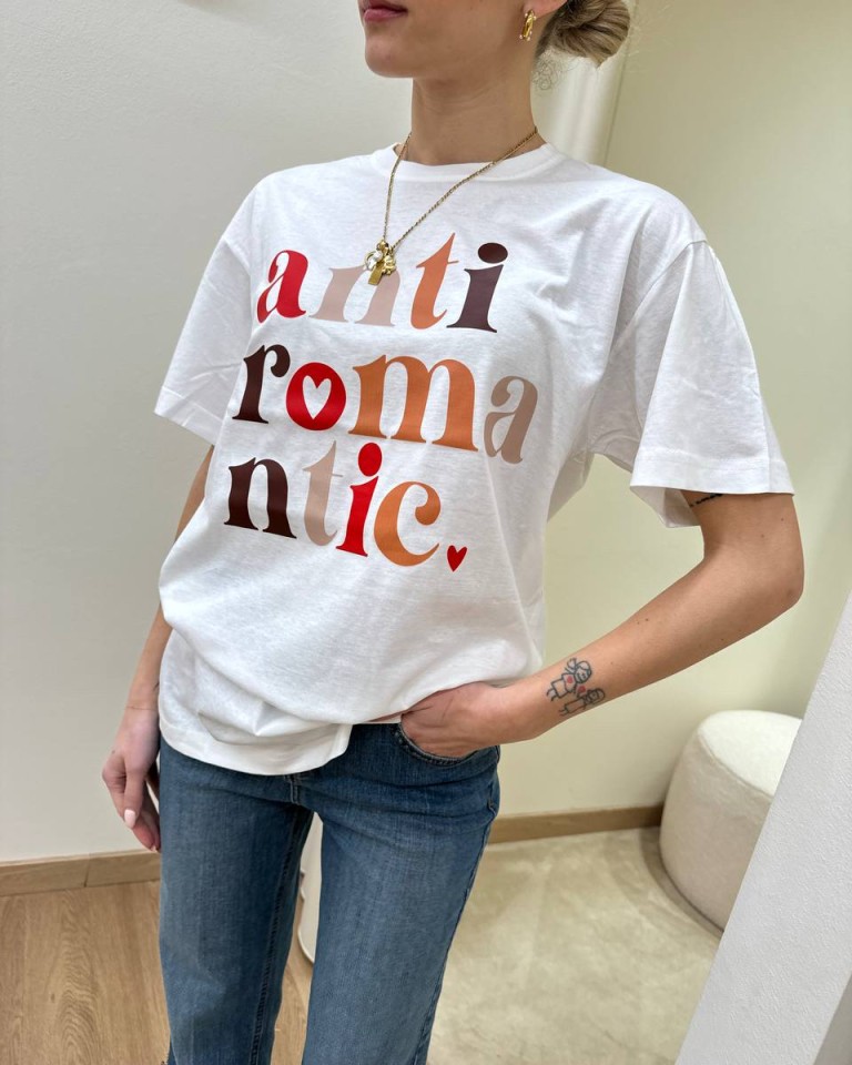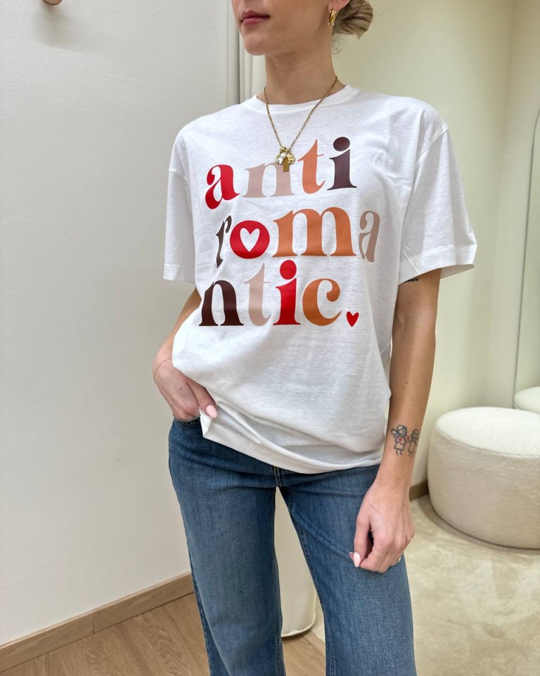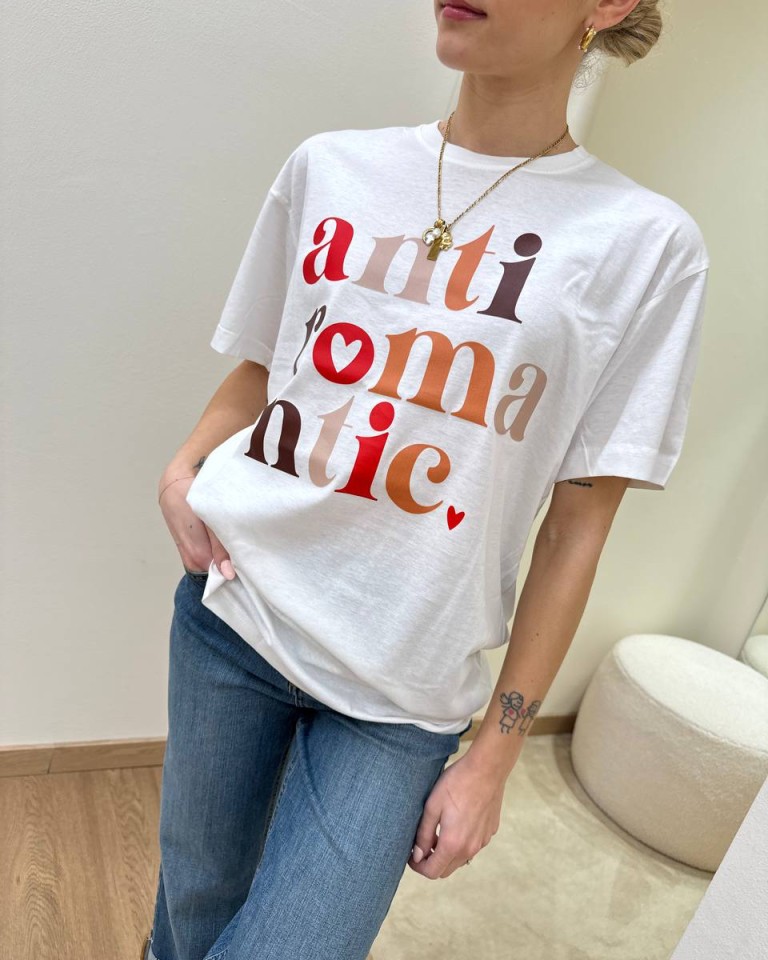 T-shirt bianca stampa “anti romantic”, modello over, girocollo e maniche corte. Vestibilità ampia.