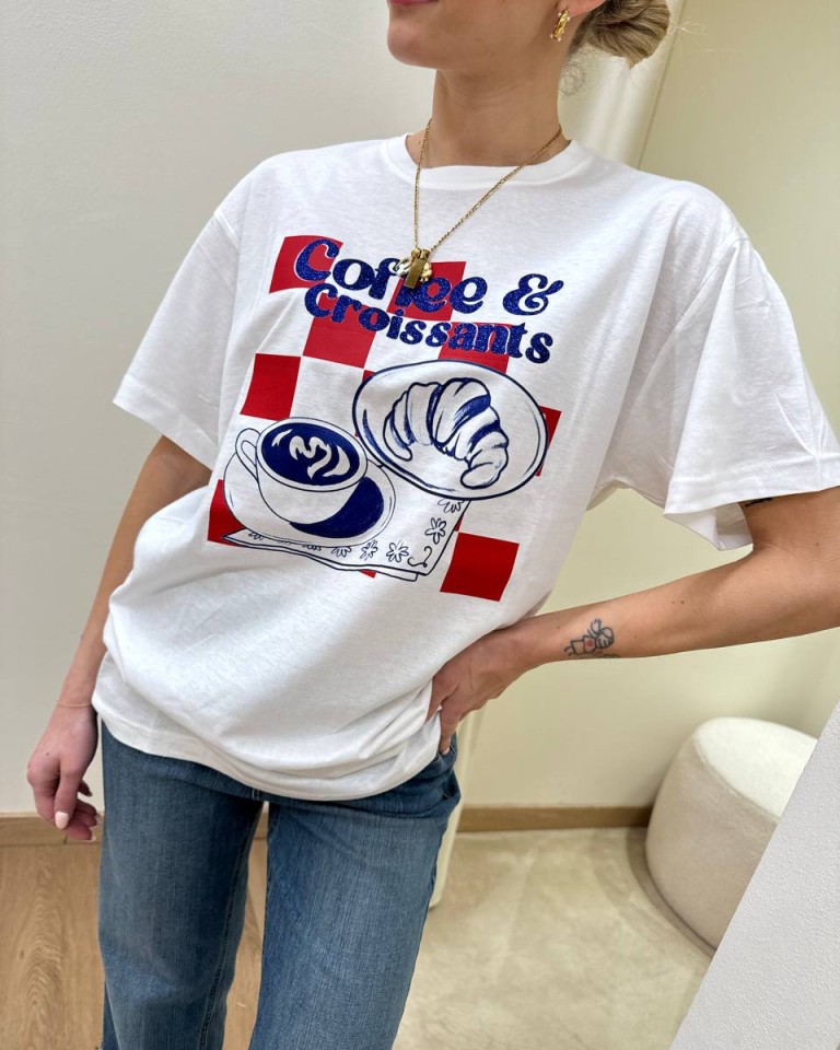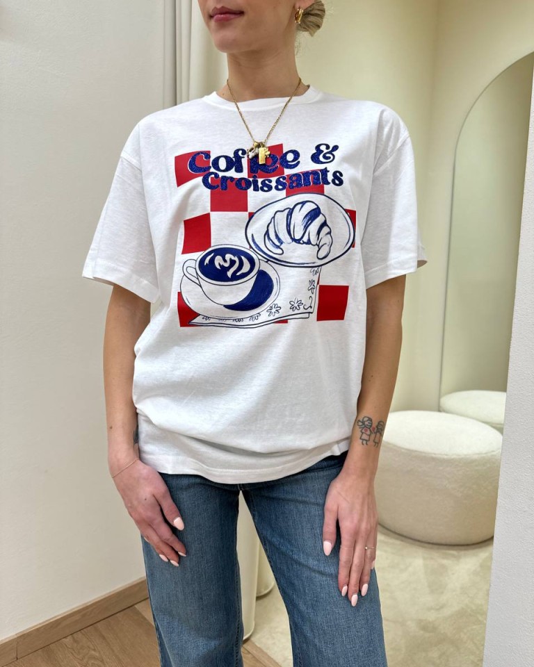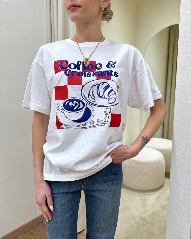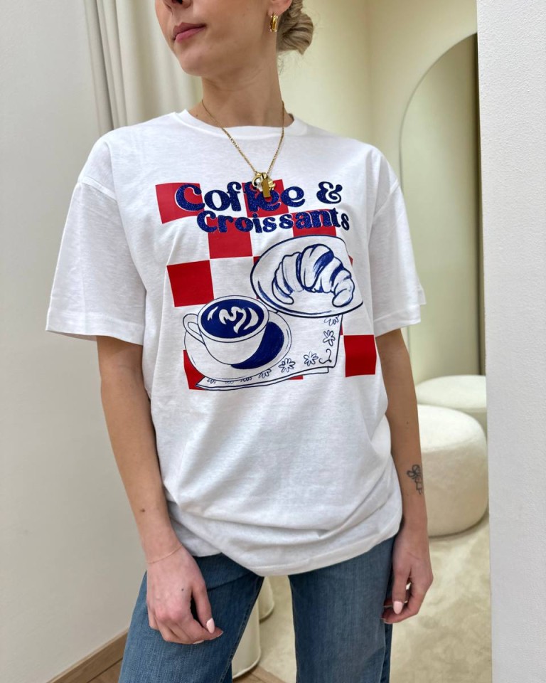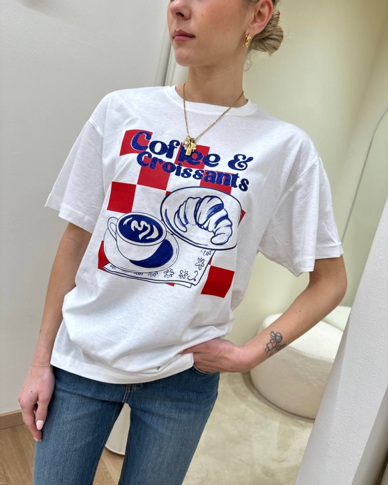 T-shirt bianca stampa “Coffee & Croissant” in rosso e blu, modello over, girocollo e maniche corte. Vestibilità ampia.