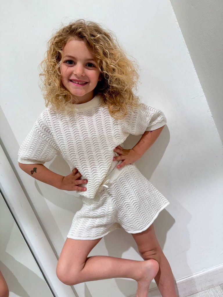 T-shirt burro in maglia lavorata e traforata, modello girocollo, con mezze maniche scese. Profilo con elastico a coste. Vestibilità morbida.