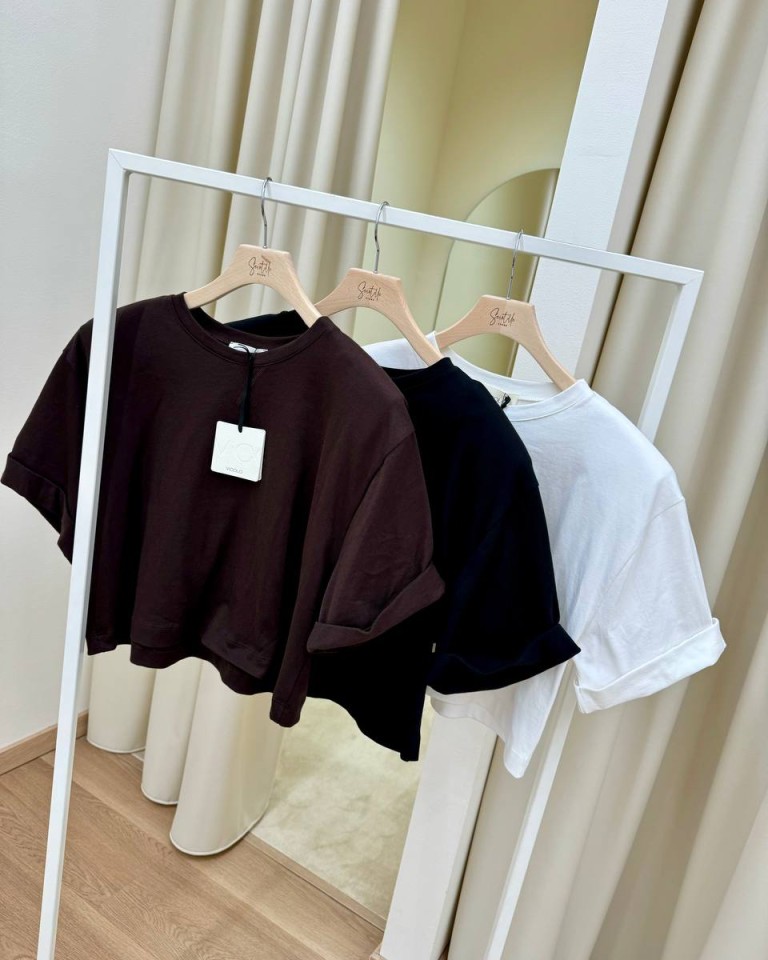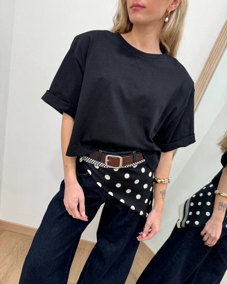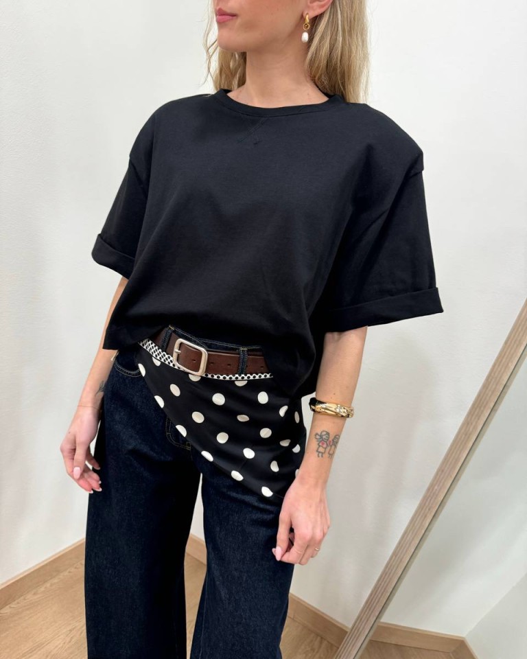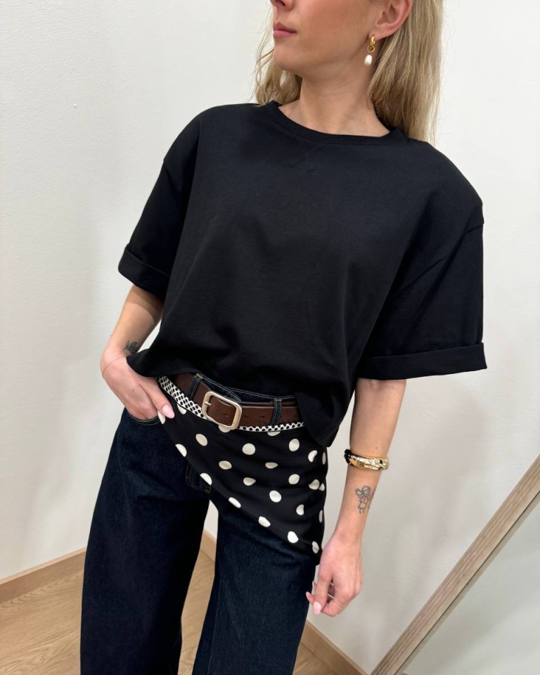 T-shirt nera, modello crop over, giro sceso e manica corta con rovescia. Vestibilità ampia.