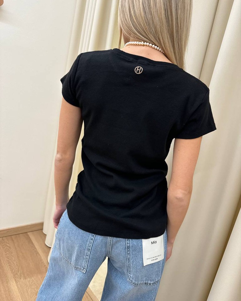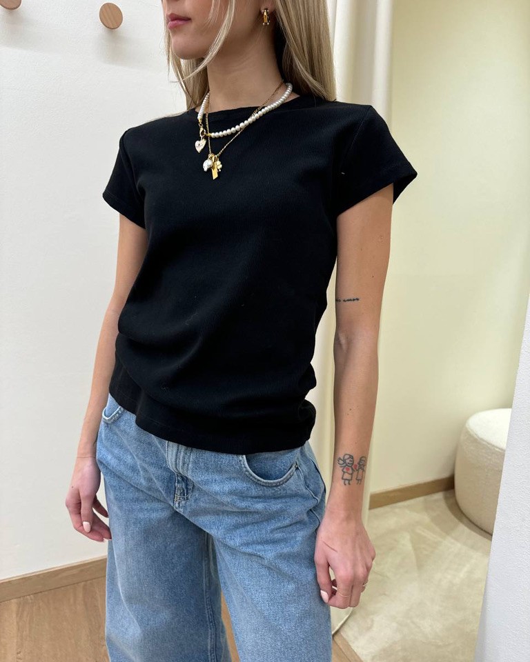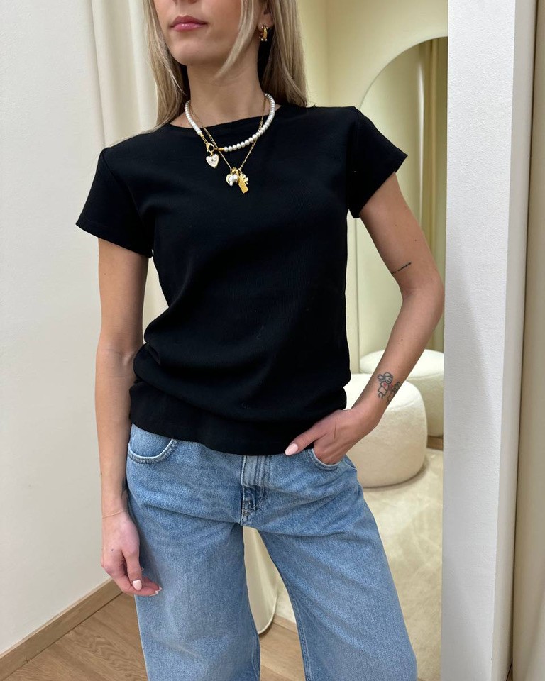 T-shirt a costine nera. Modello a mezze maniche, girocollo. Vestibilità regolare elasticizzata.