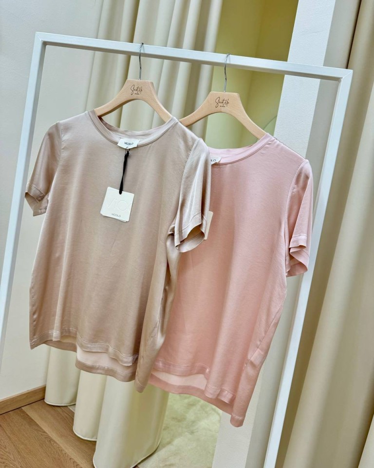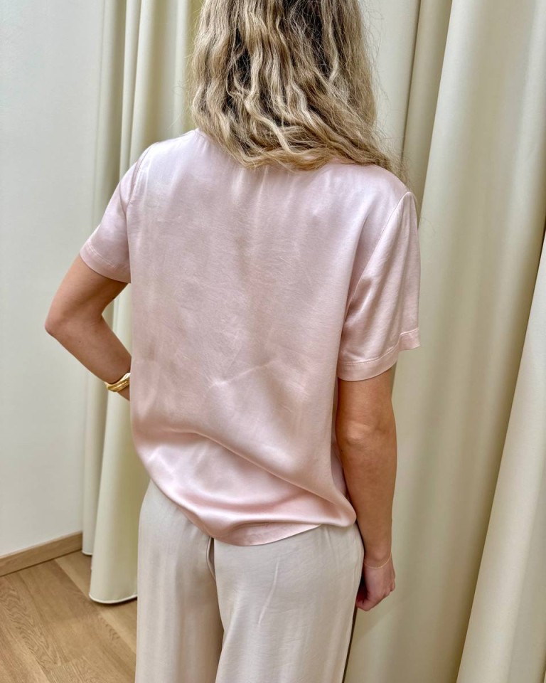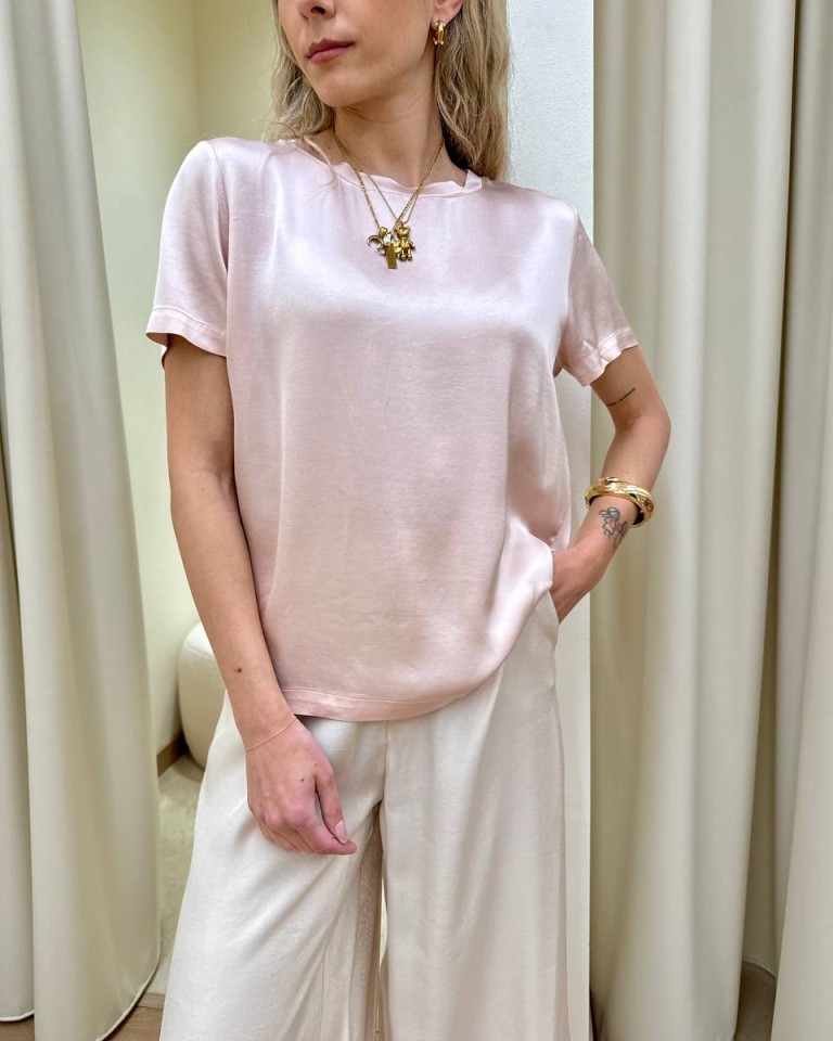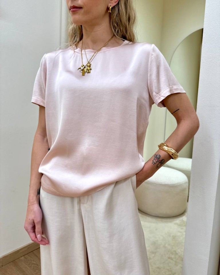 T-shirt in raso di viscosa color rosa antico. Modello basic, girocollo, manica corta. Vestibilità regolare.