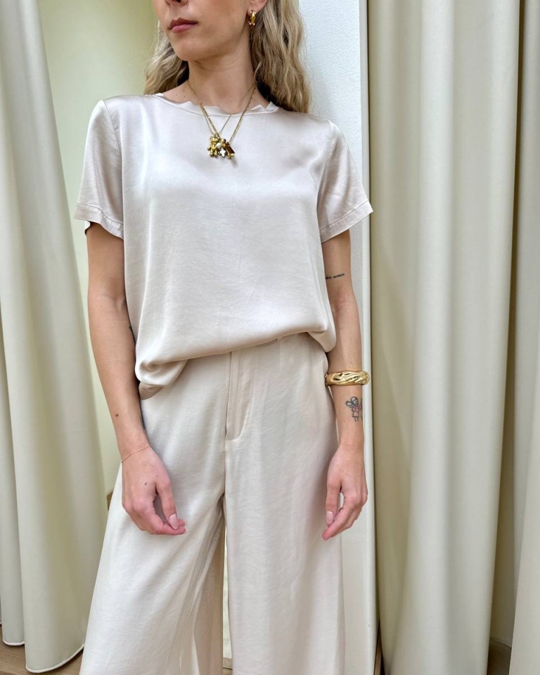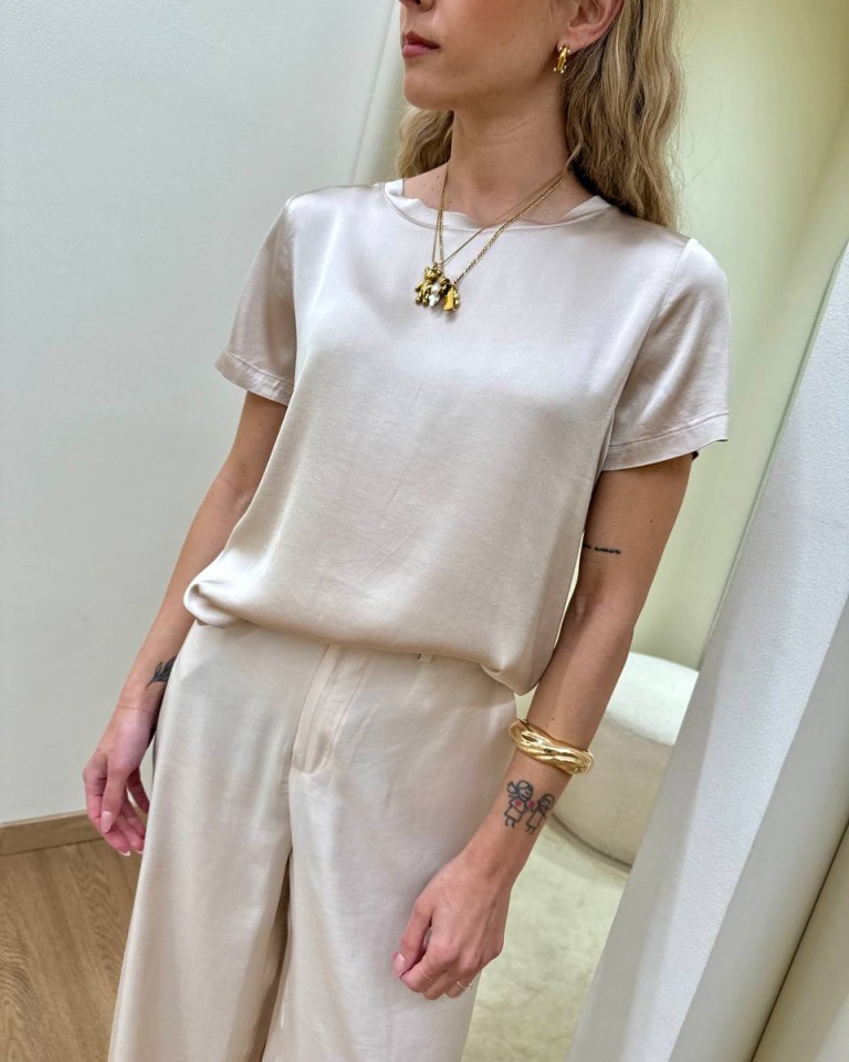 T-shirt in raso di viscosa color sabbia. Modello basic, girocollo, manica corta. Vestibilità regolare.