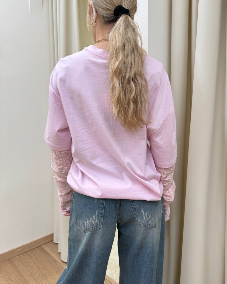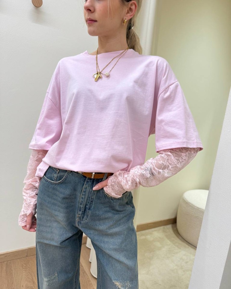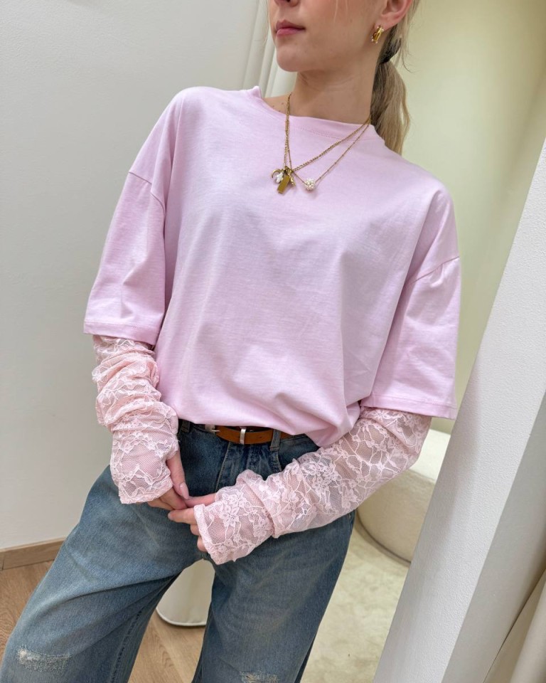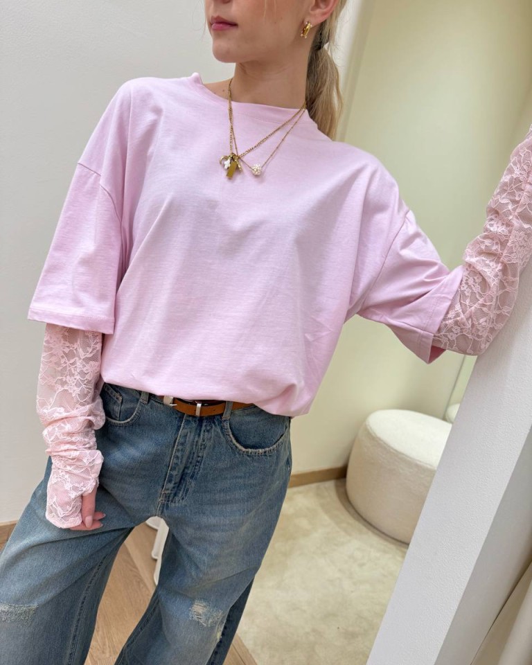 T-shirt rosa pastello, modello oversize, girocollo con maniche in pizzo aderenti in tono con foro per pollice. Vestibilità ampia.