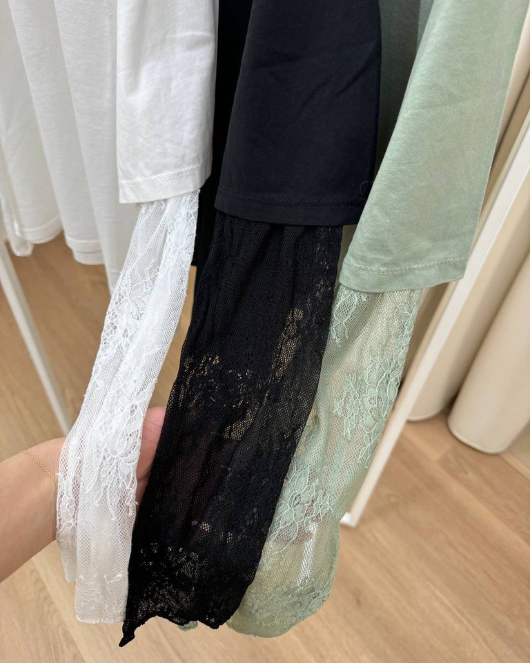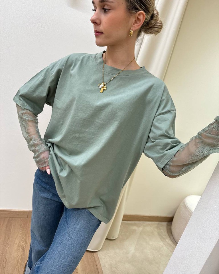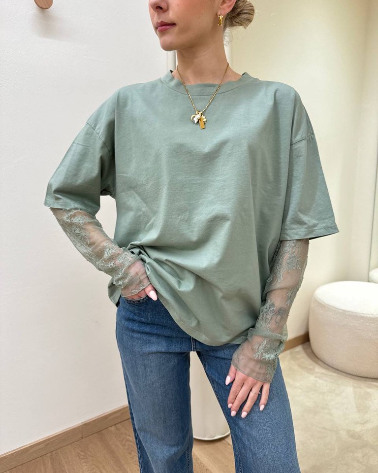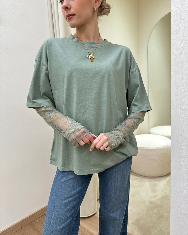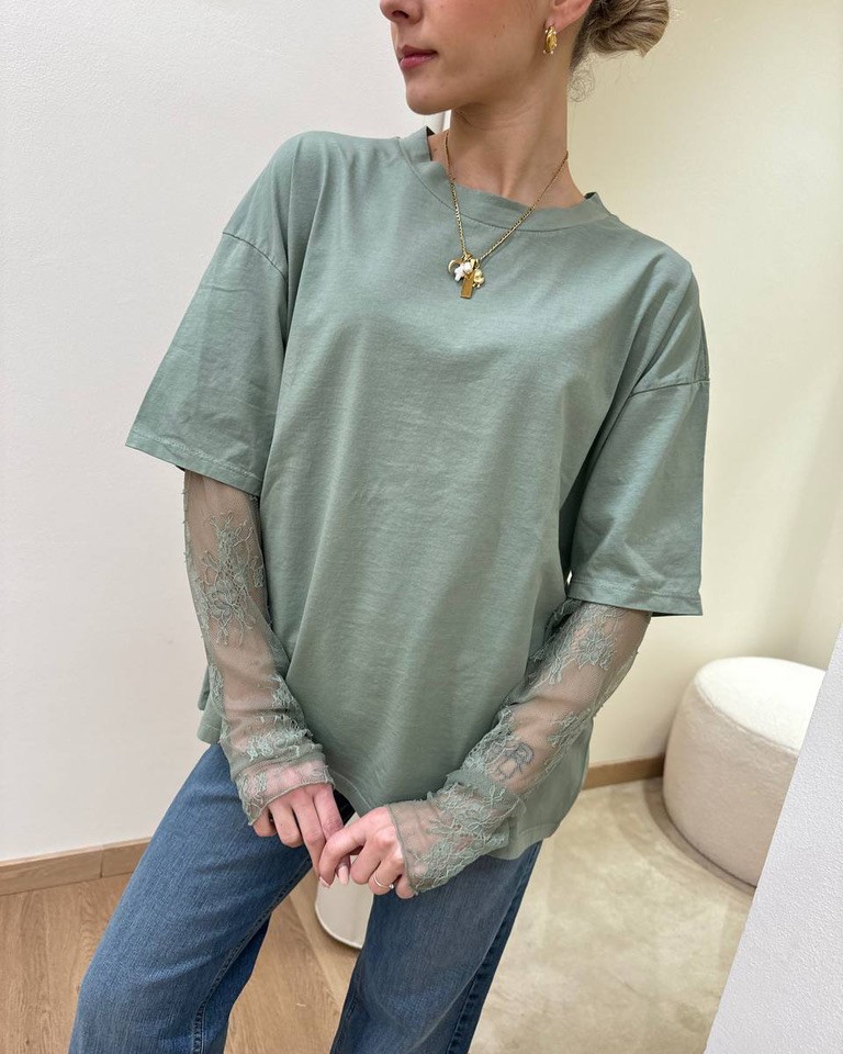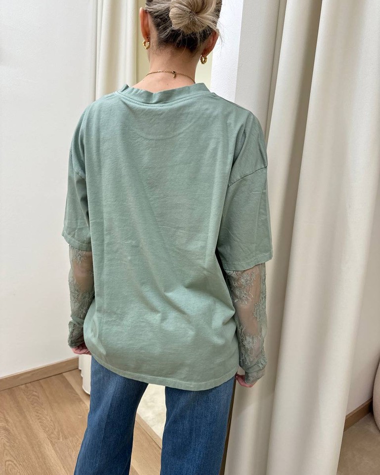 T-shirt verde salvia, modello oversize, girocollo con maniche in pizzo aderenti in tono. Vestibilità ampia.