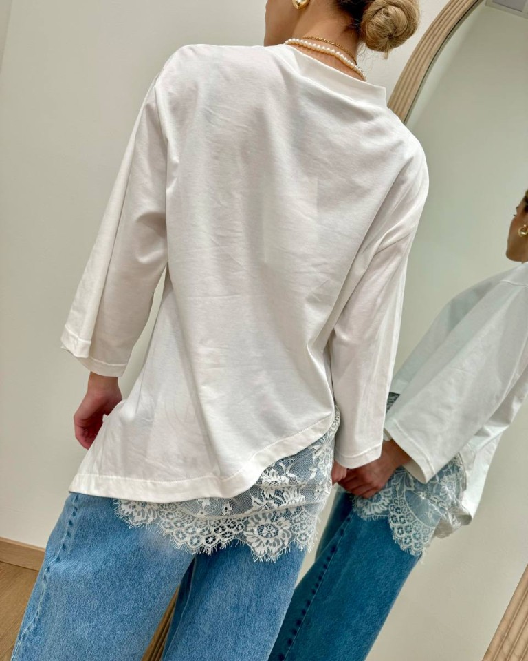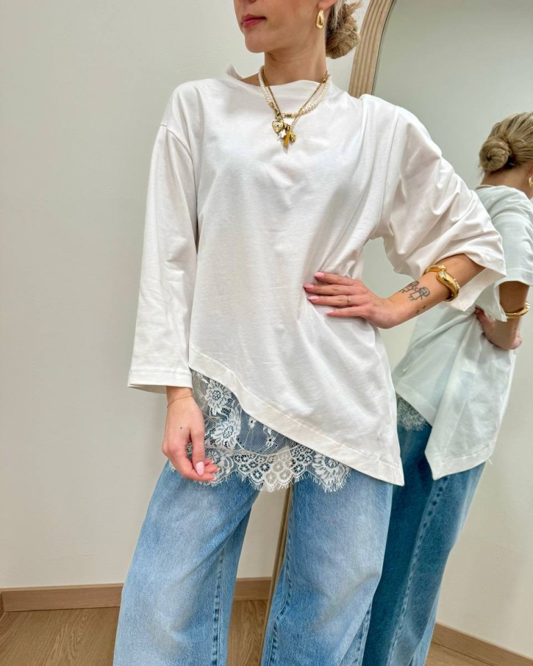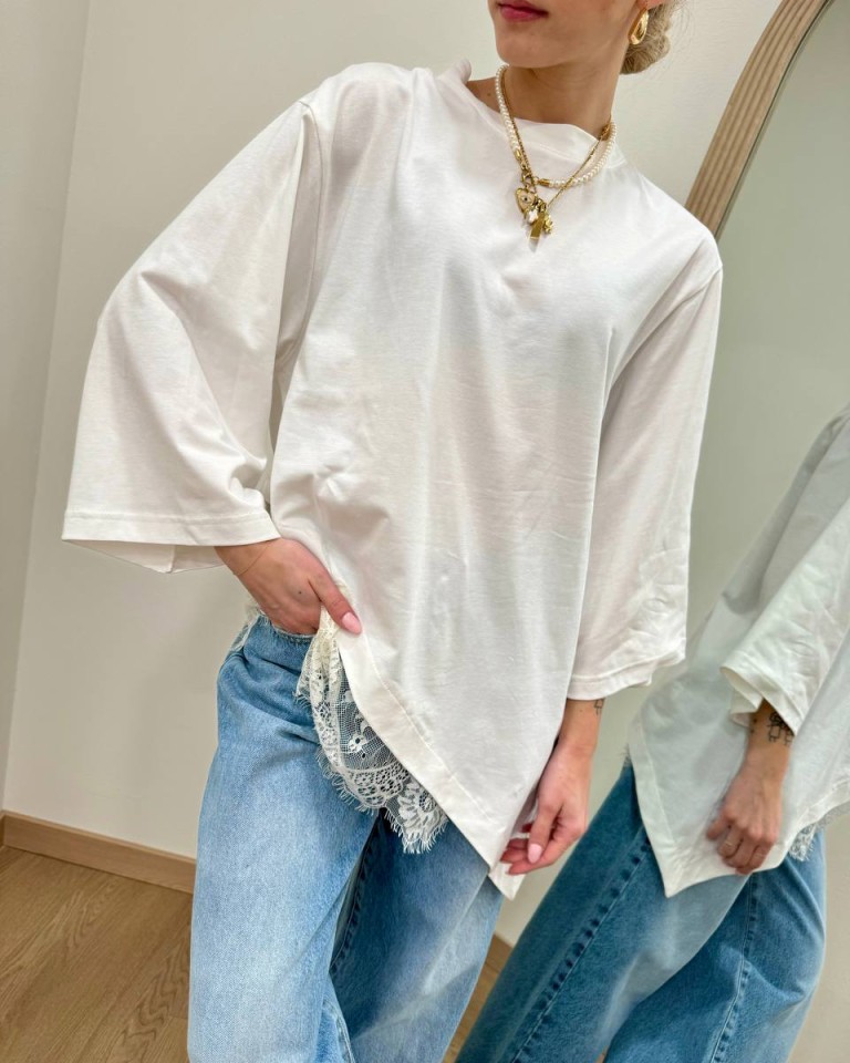 T-shirt bianca asimmetrica con inserto in pizzo panna, modello over, maniche a 3/4, girocollo. Vestibilità ampia.