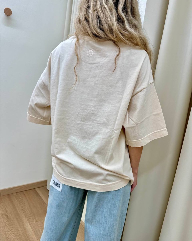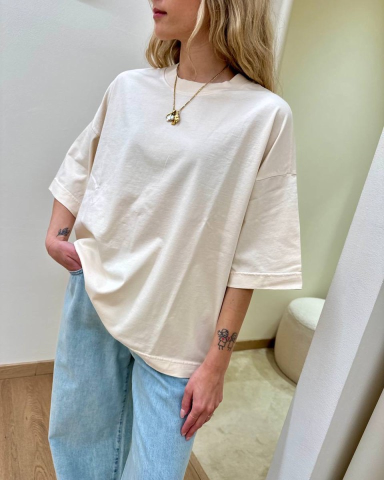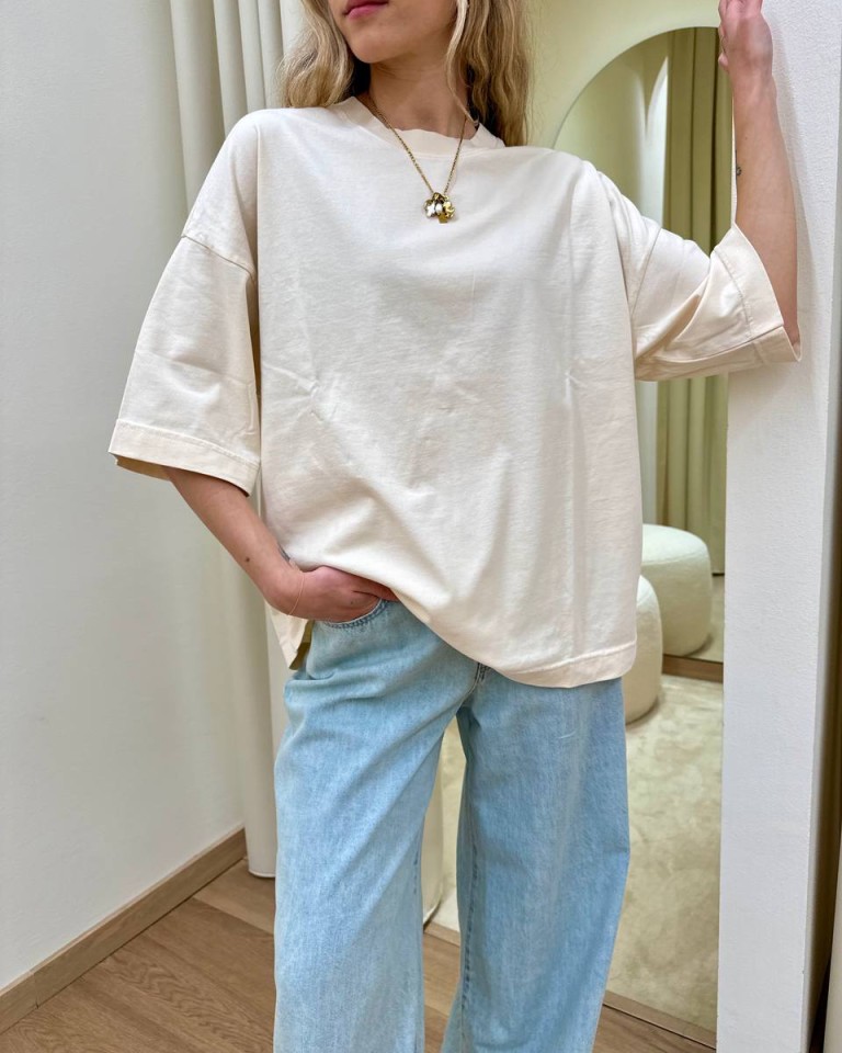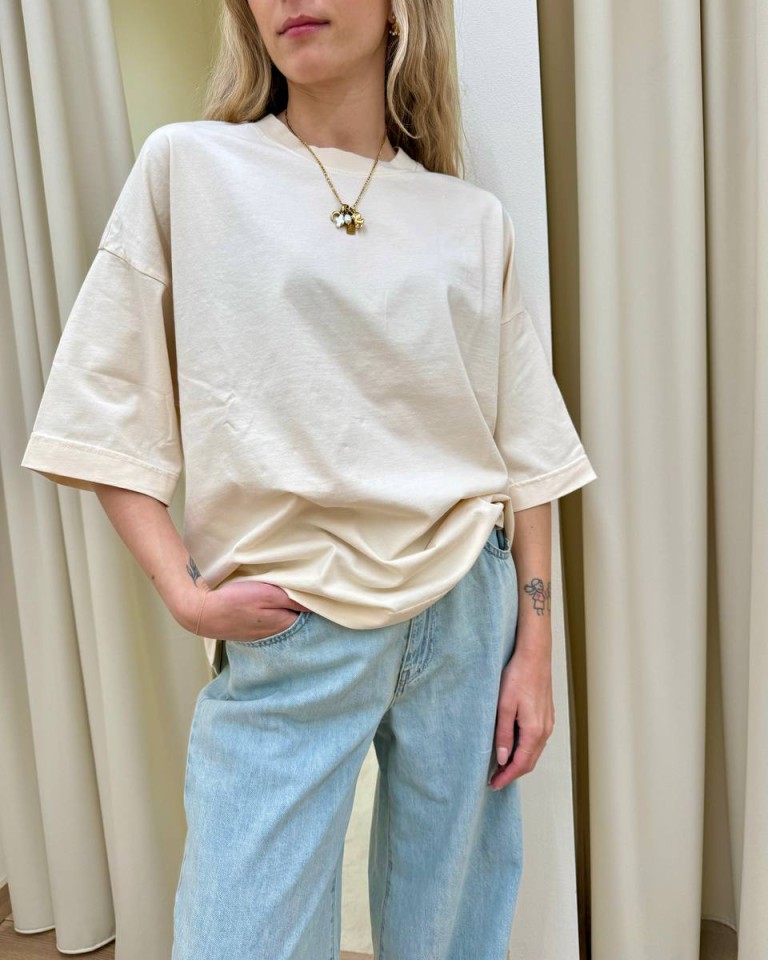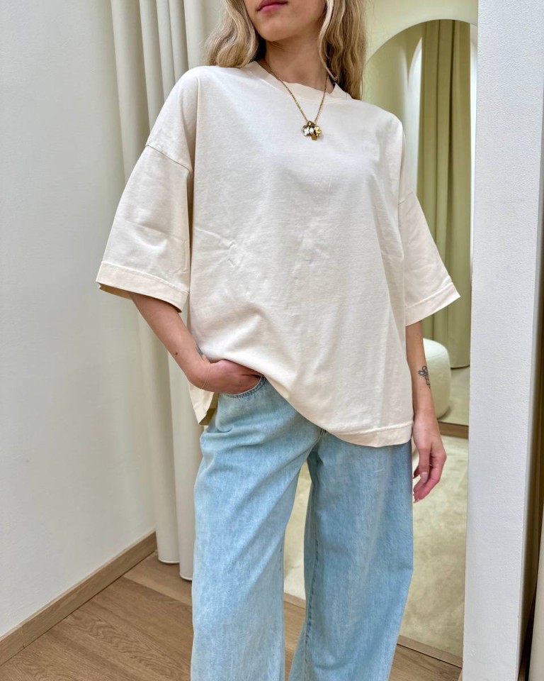 T-shirt color burro, modello basic oversize girocollo con maniche corte e giro sceso. Vestibilità ampia.