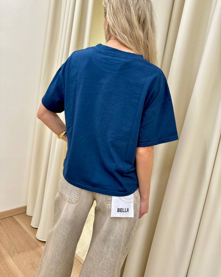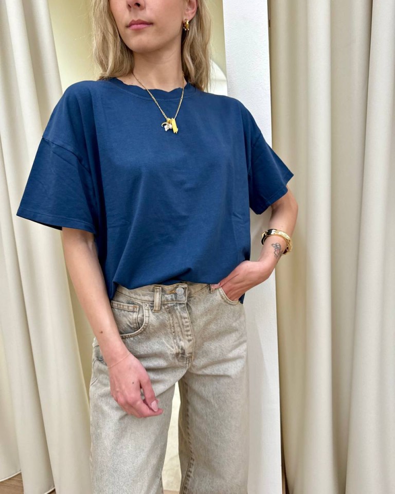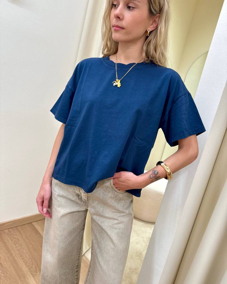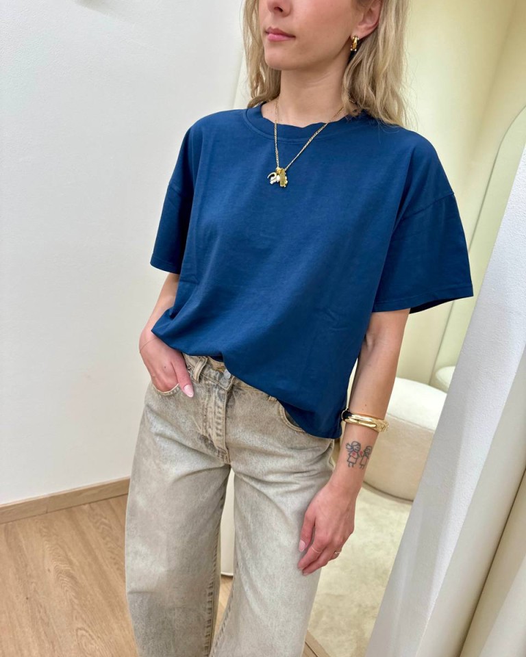 T-shirt blu, modello basic oversize a scatoletta, girocollo con maniche corte ampie e scese. Vestibilità ampia.