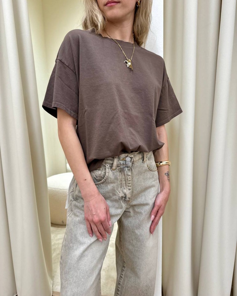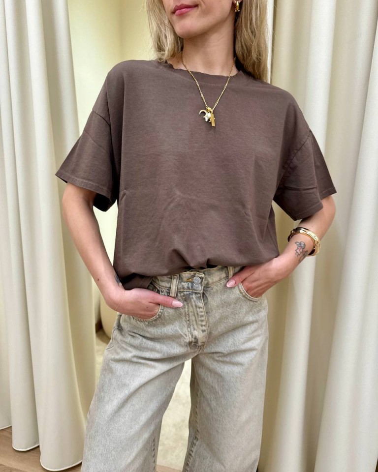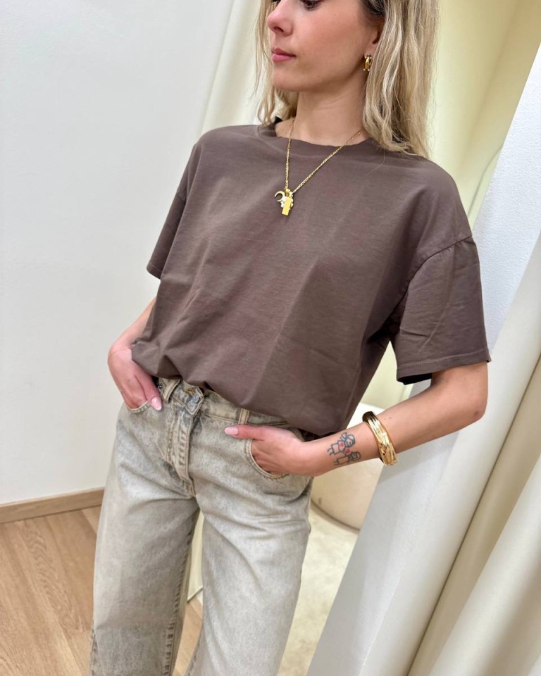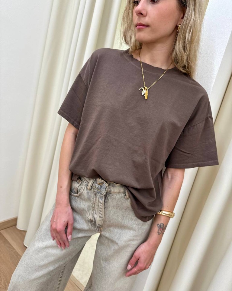 T-shirt cioccolato, modello basic oversize a scatoletta, girocollo con maniche corte ampie e scese. Vestibilità ampia.