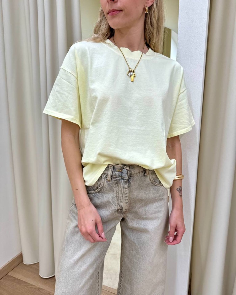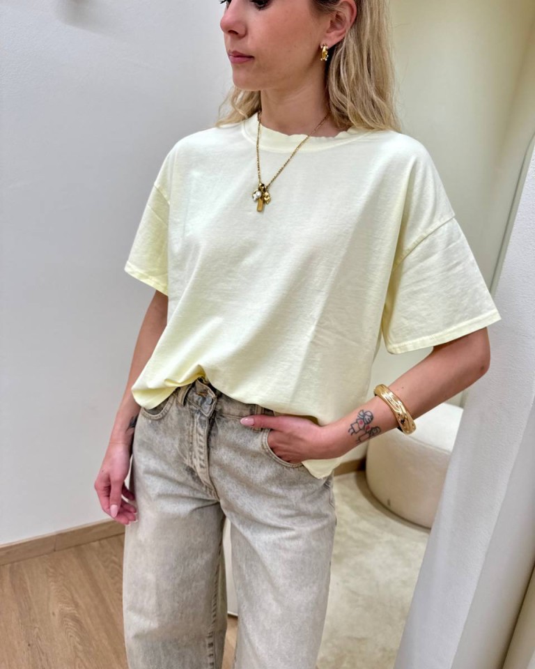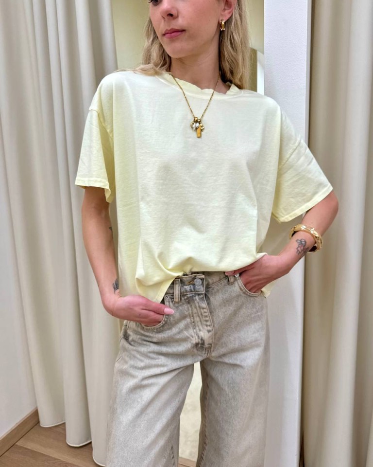 T-shirt giallo pastello, modello basic oversize a scatoletta, girocollo con maniche corte ampie e scese. Vestibilità ampia.
