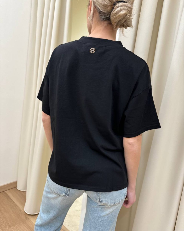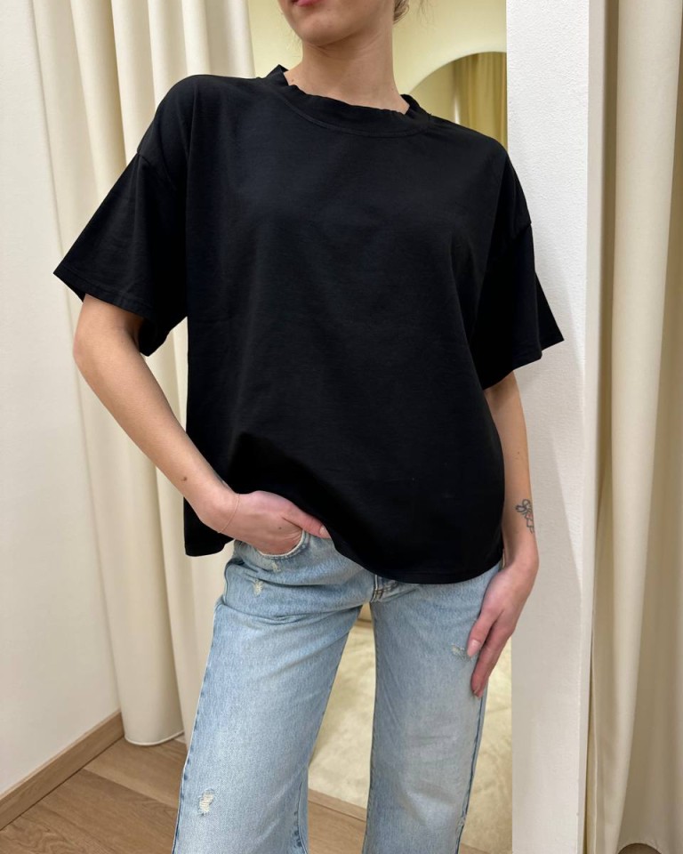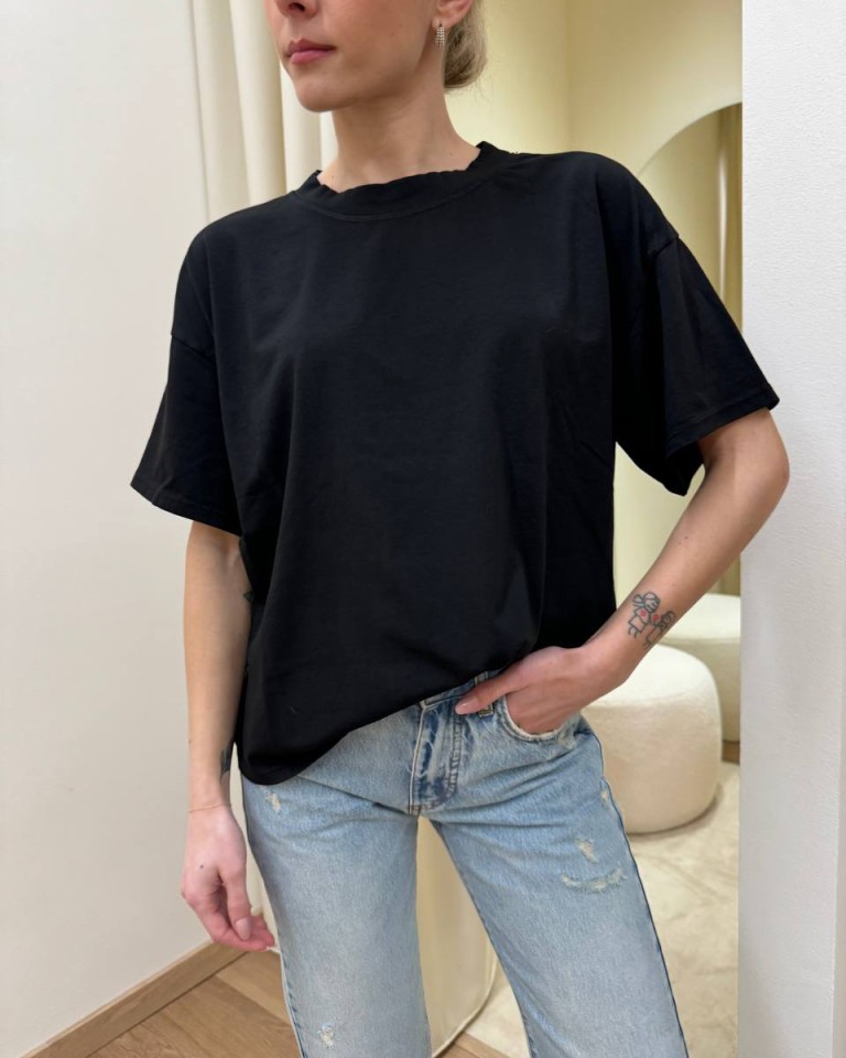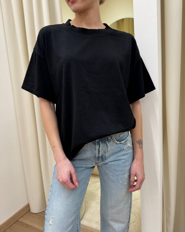 T-shirt nera, modello basic oversize a scatoletta, girocollo con maniche corte ampie e scese. Vestibilità ampia.