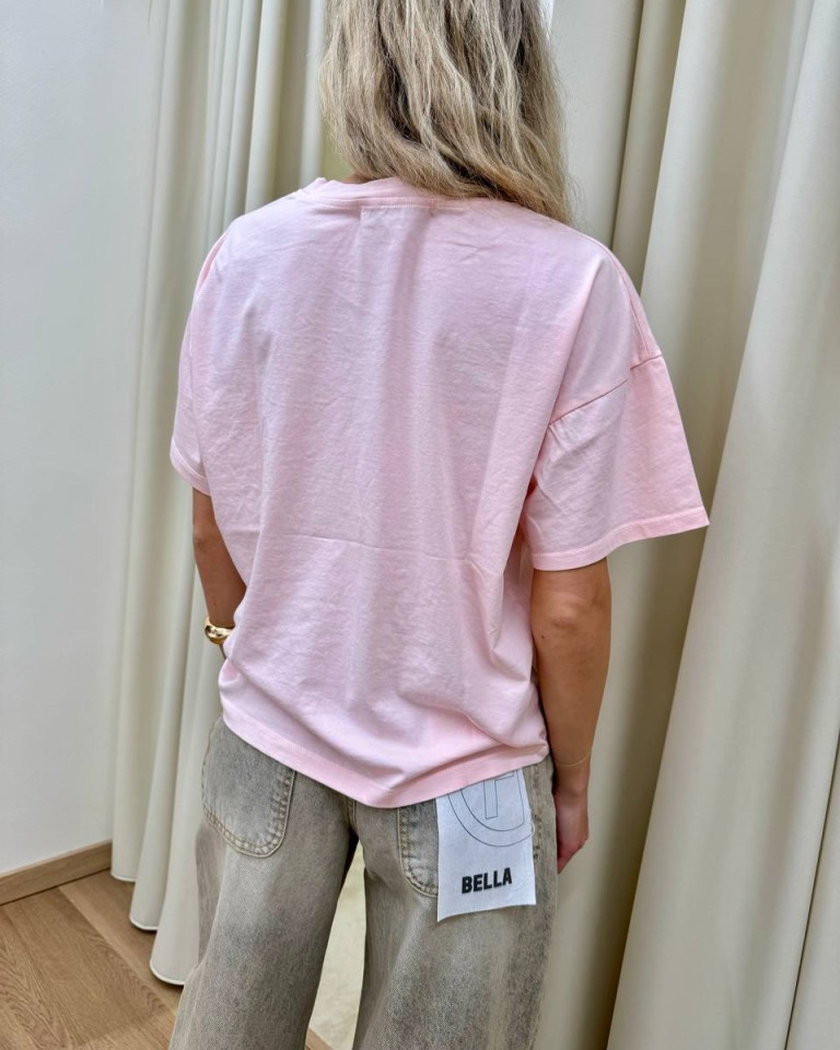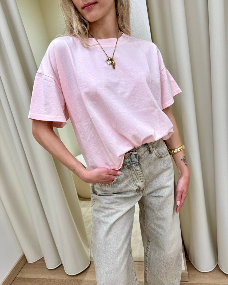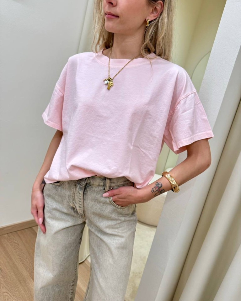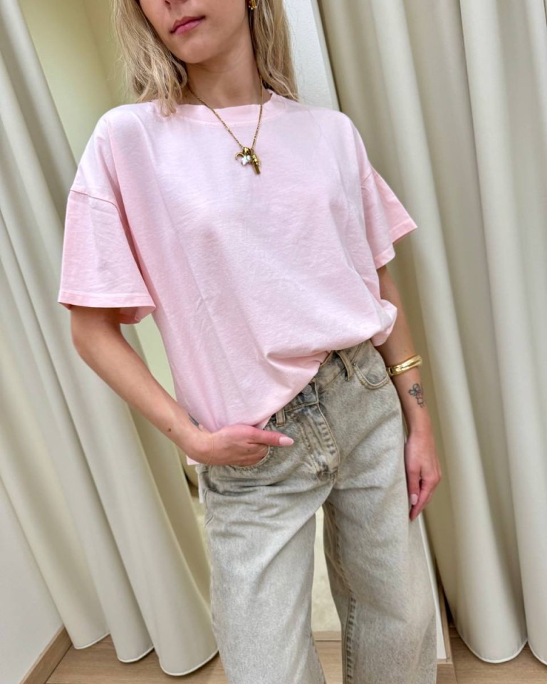T-shirt rosa pastello, modello basic oversize a scatoletta, girocollo con maniche corte ampie e scese. Vestibilità ampia.