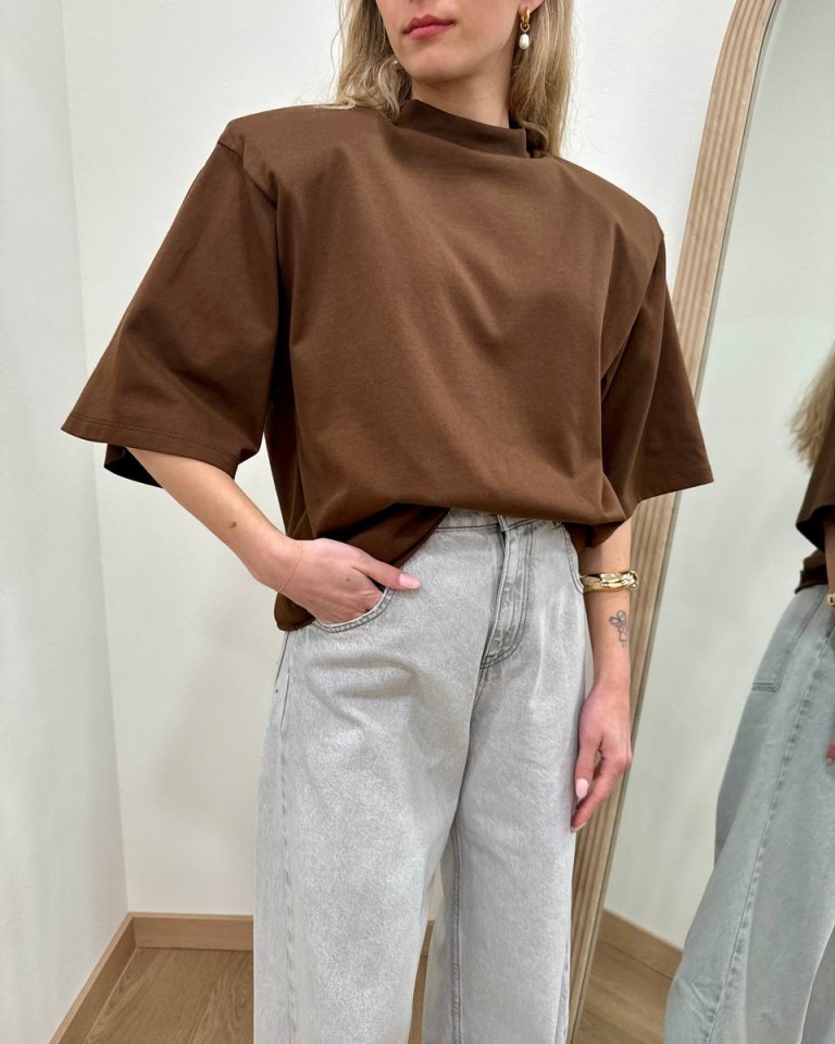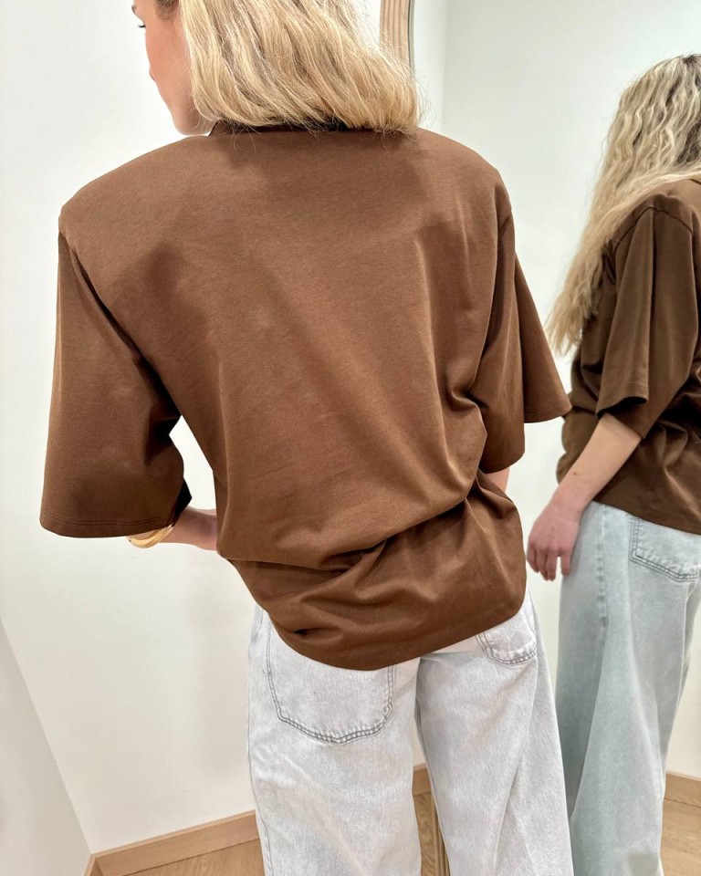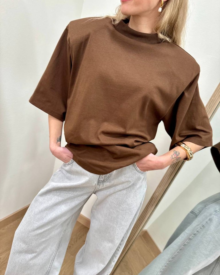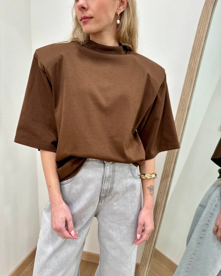 T-shirt color cioccolato, modello over, giro sceso e manica corta ampia con maxi spalline imbottite. Vestibilità ampia.