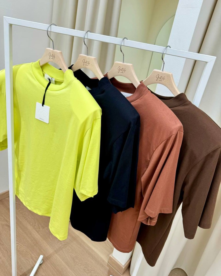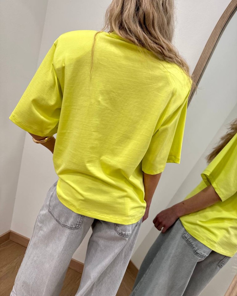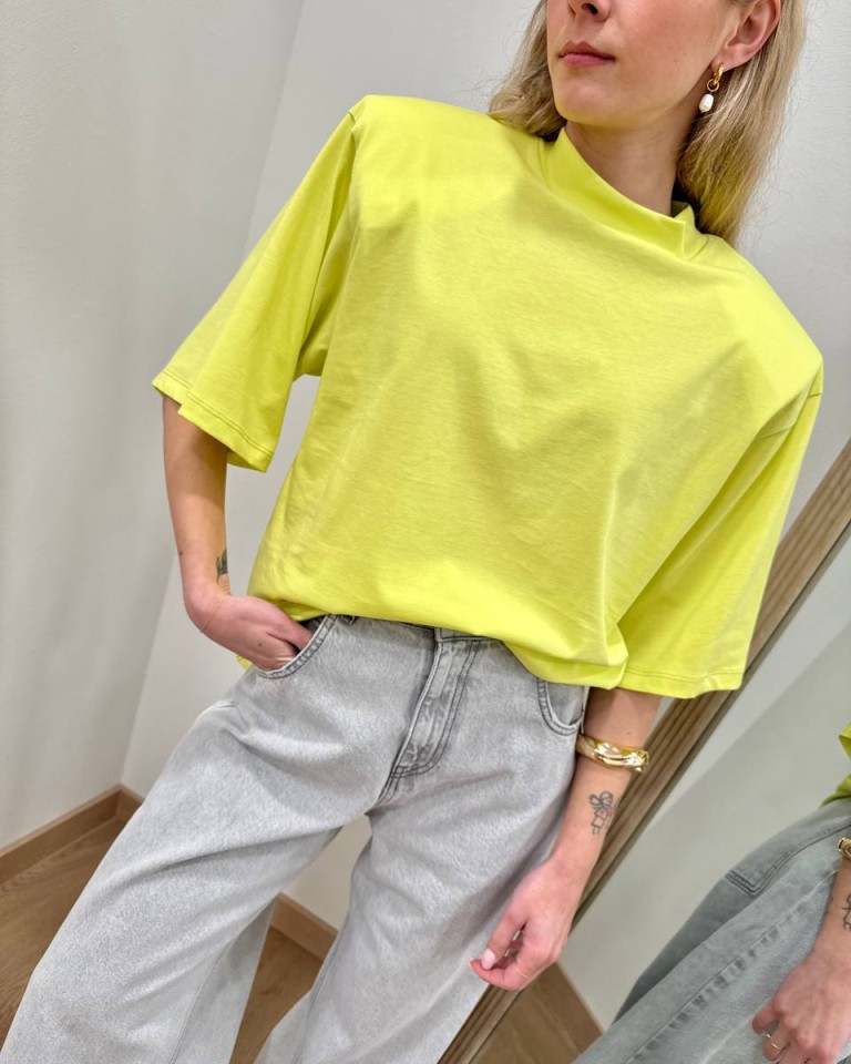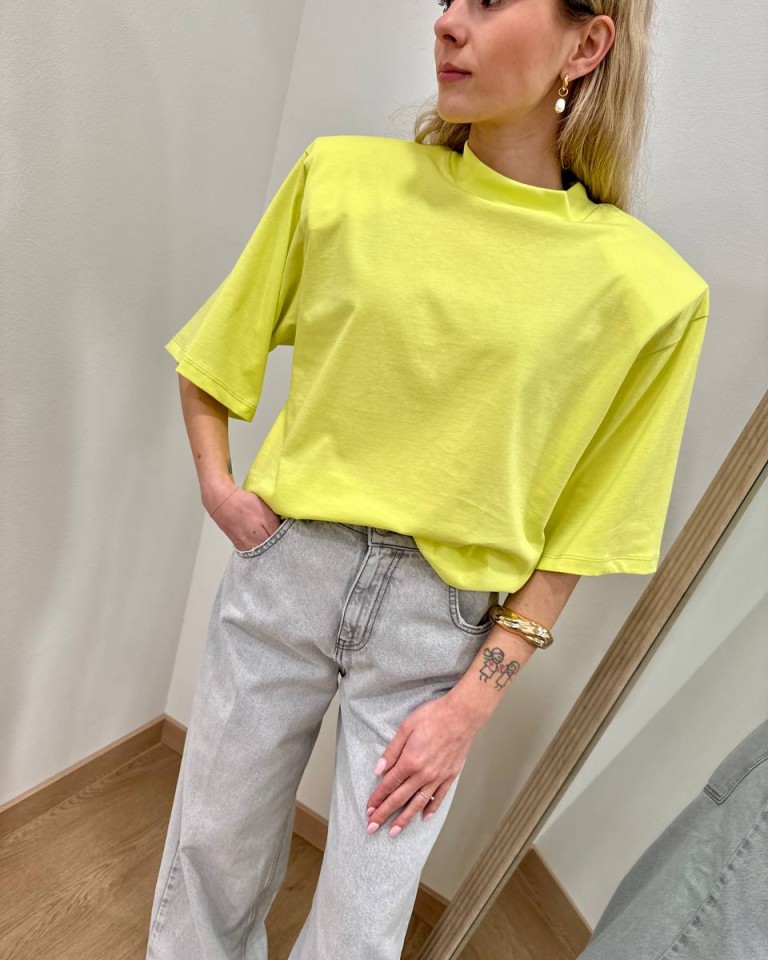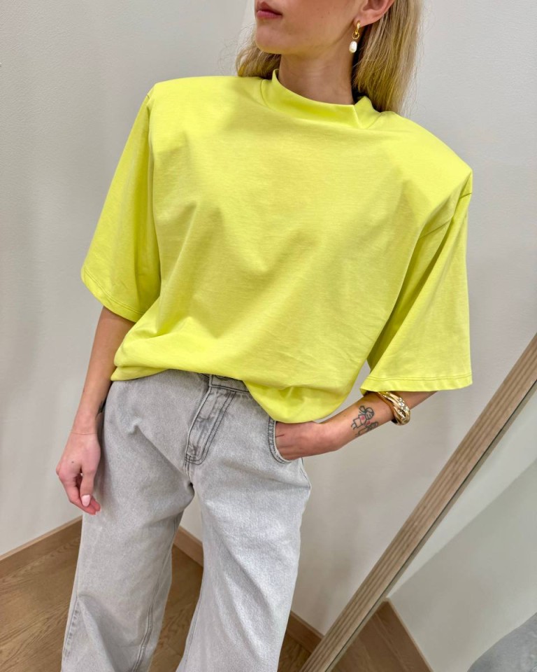 T-shirt color giallo acido, modello over, giro sceso e manica corta ampia, maxi spalline imbottite. Vestibilità ampia.