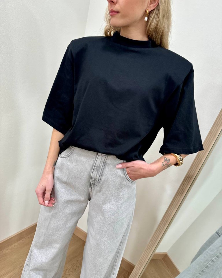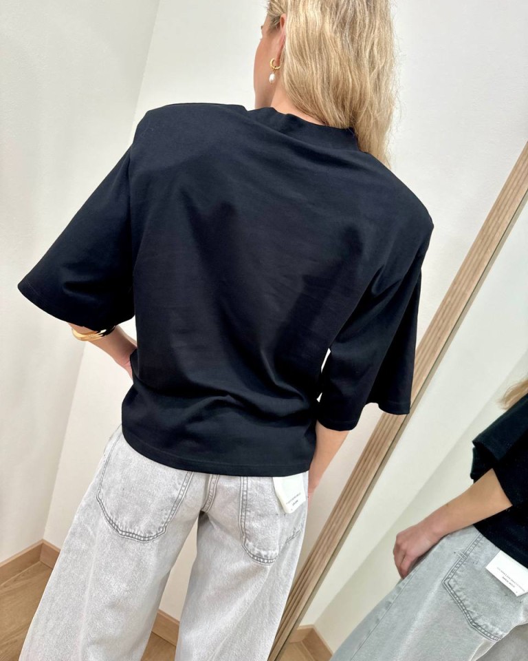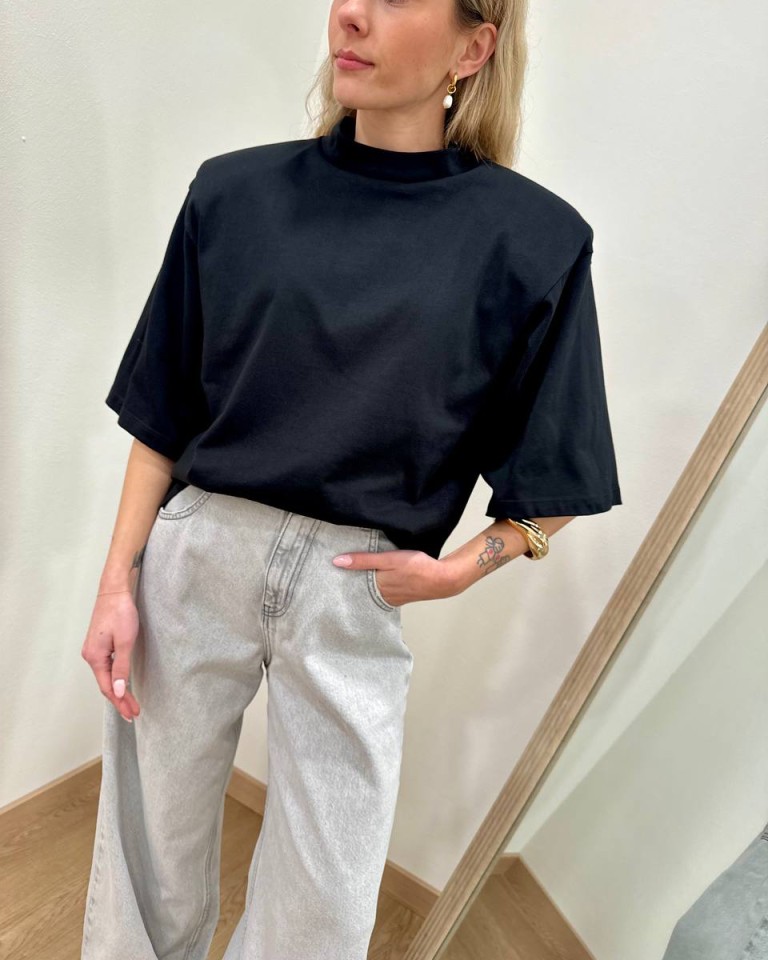 T-shirt nera, modello over, giro sceso e manica corta ampia con maxi spalline imbottite. Vestibilità ampia.