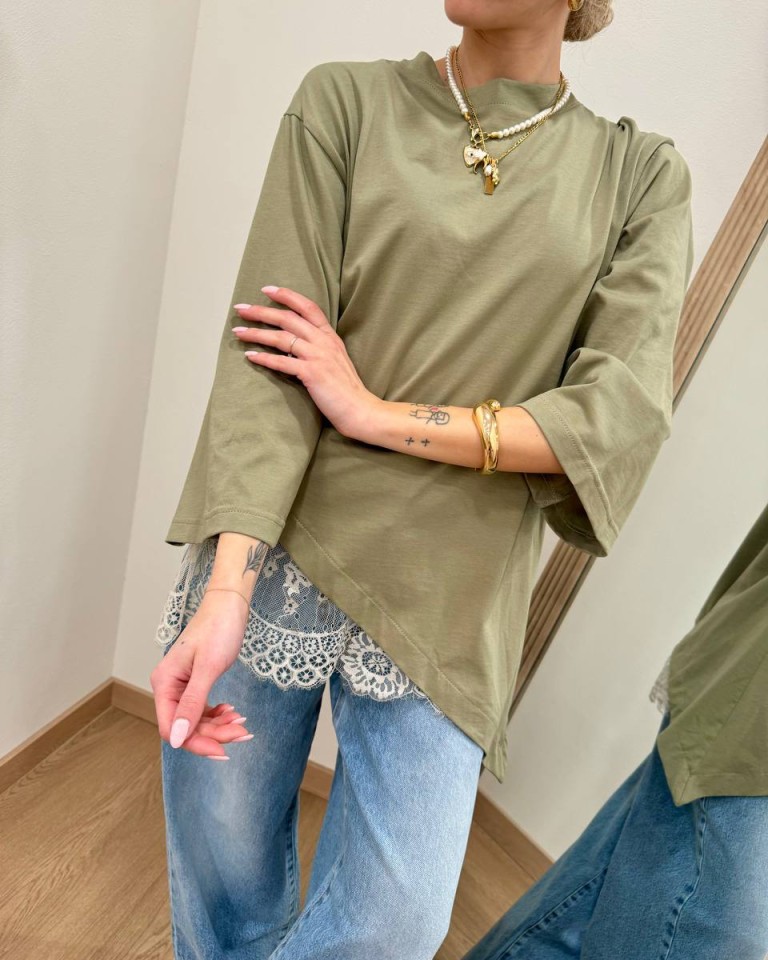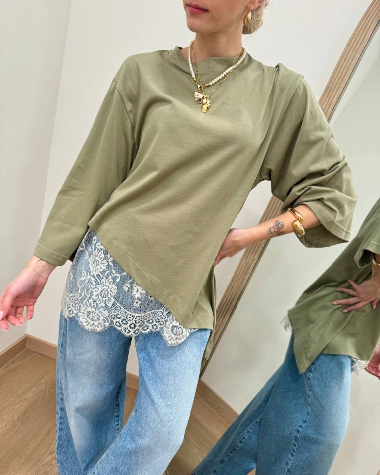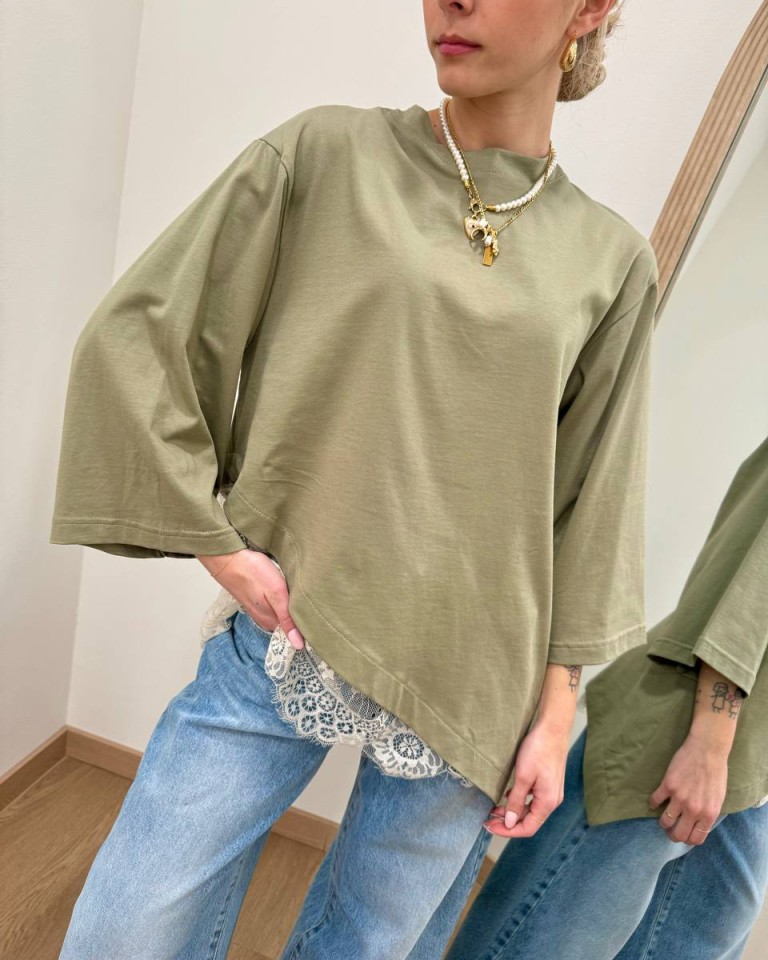 T-shirt verde salvia asimmetrica con inserto in pizzo panna, modello over, maniche a 3/4, girocollo. Vestibilità ampia.