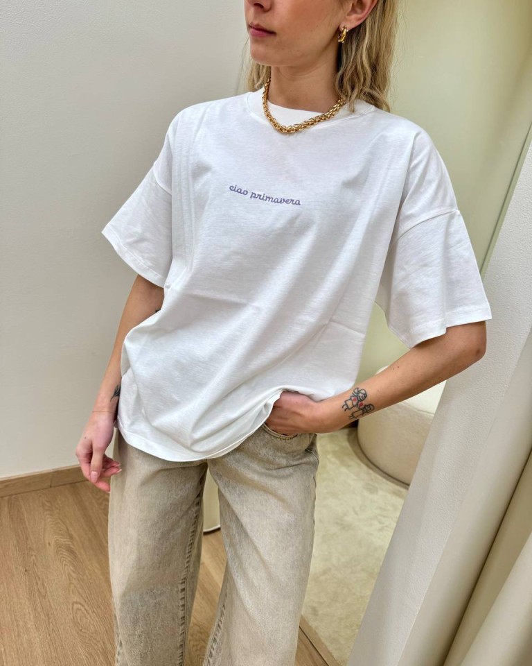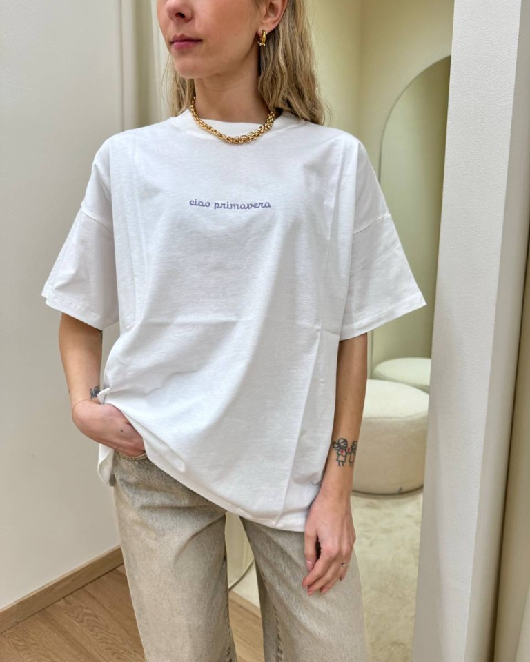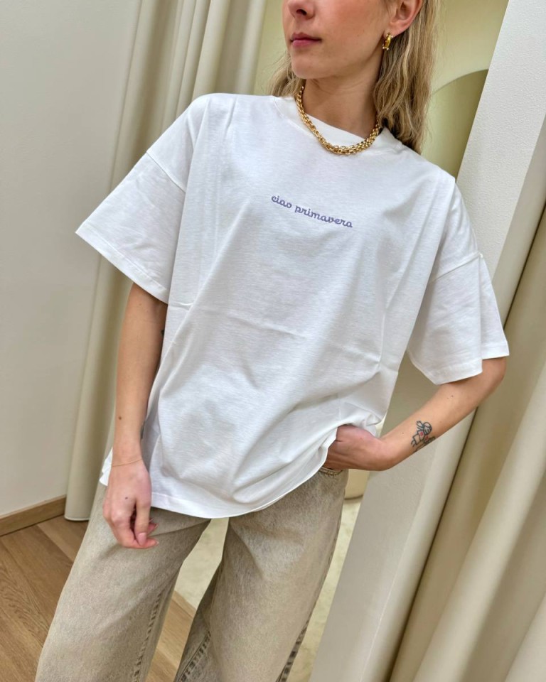 T-shirt bianca ricamo lilla “Ciao Primavera”, modello basic oversize, girocollo con maniche corte ampie e scese. Vestibilità ampia.