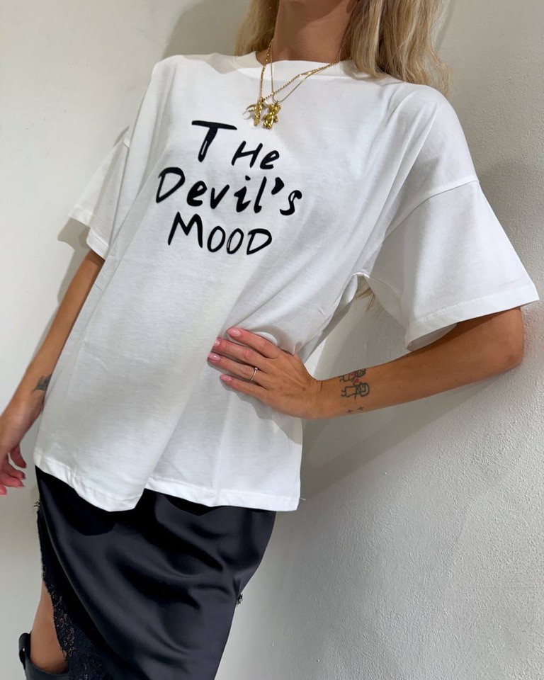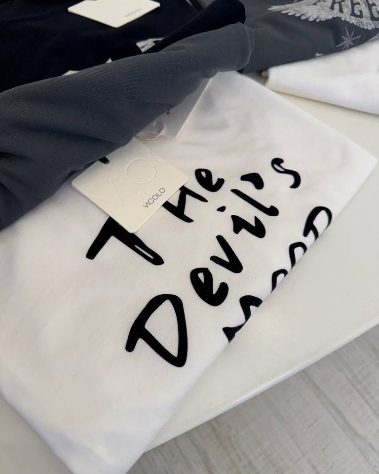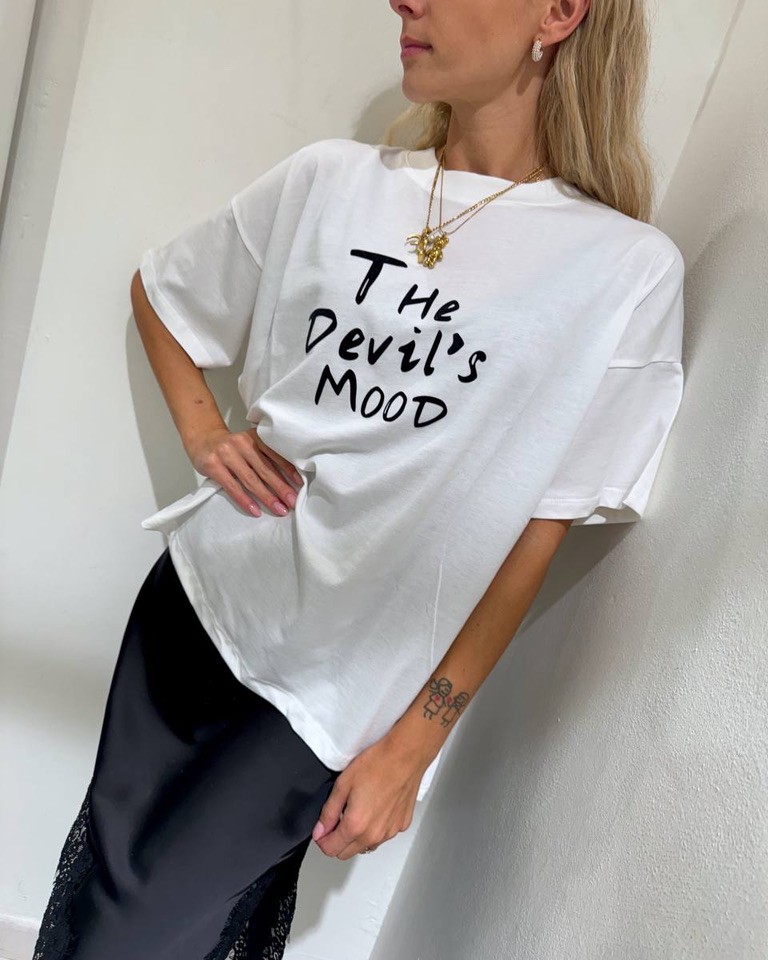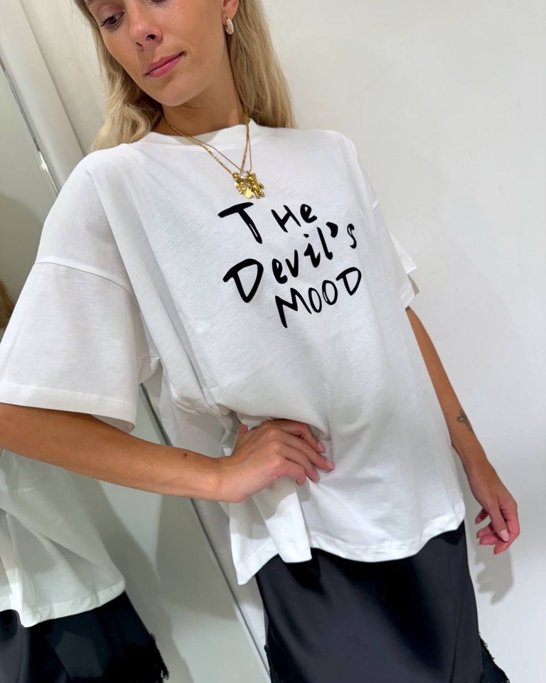 T-shirt bianca in 100% cotone con scritta centrale in velluto “The Devil’s Mood” , modello oversize, girocollo con maniche corte ampie e scese. Vestibilità ampia.