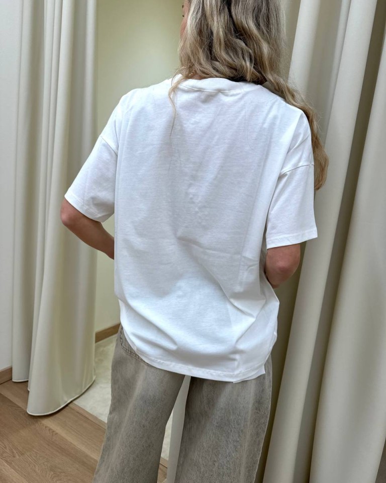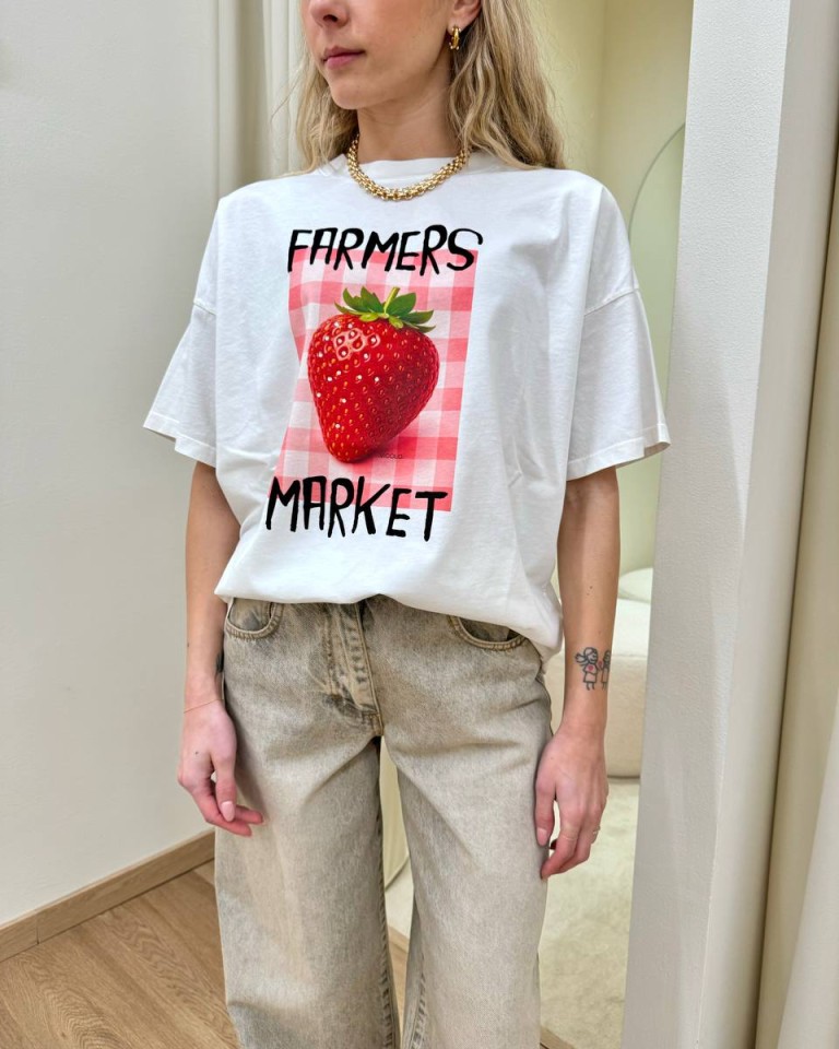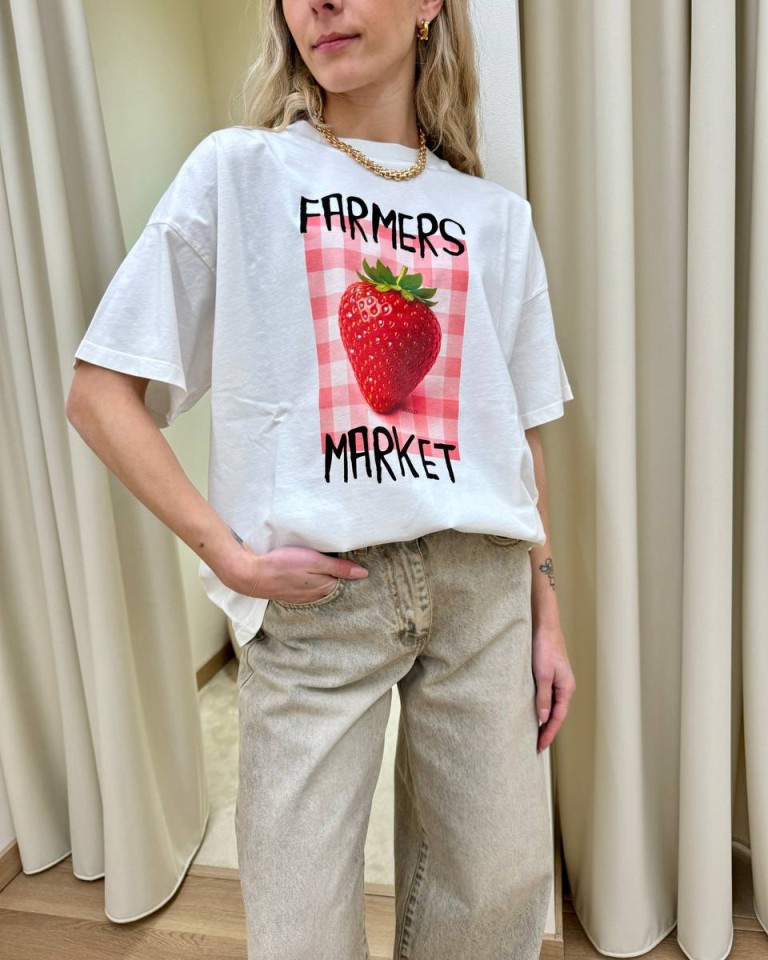T-shirt bianca stampa fragola “Farmer Market”, modello basic oversize, girocollo con maniche corte ampie e scese. Vestibilità ampia.